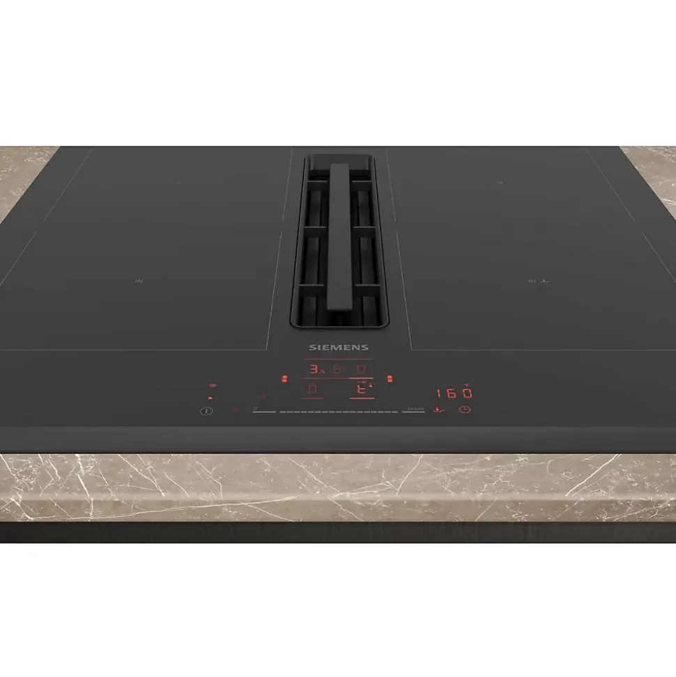 Table de cuisson aspirante induction 59cm 4 feux 7400w noir Siemens – Table de cuisson ED631HQ26E de Siemens design avec aspiration intégrée. CombiZone : combinez deux zones de cuisson à induction pour chauffer vos grandes casseroles. TouchSlider :contrôlez la puissance de votre table de cuisson du bout du doigt. Le module d’aspiration d’inductionAir Plus garantit un niveau sonore minimal sans compromettre la puissance d’extraction. Une hotte intégrée facile à nettoyer. Home Connect : obtenez des informations sur votre table de cuisson où que vous soyez via tablette ou smartphone. – Type de produit : Foyer en vitrocéramique.Design : Encastrable.Type d’énergie : Électrique.Témoin de chaleur résiduelle : Indépendant.Emplacement du bandeau de commande : Devant.Matériau de la surface : Vitrocéramique.Brûleurs : Non.powerBoost : Toutes les zones de cuisson.Puissance du 2nd foyer : 3.6 kW.Nombre de vitesses : 9-stage + 2 intensive.Débit d’aspiration max. en évacuation : 500 m³/h.Débit de l’aspiration en Recyclage d’air position turbo : 595.0 m³/h.Débit d’aspiration max. en recyclage : 487 m³/h.Débit d’air position intensive en évacuation : 622 m³/h.Niveau Sonore : 69 dB(A) re 1 pW.Filtre anti-odeurs : Non.Accessoires inclus : 1 x Connecteur télescopique mode recyclage, 1 x Filtre à charbon Clean Air Plus.Puissance de raccordement : 7.4 kW.Tension : 220-240/380-415 V.Fréquence : 50-60 Hz.Couleur de la surface : Noir.Longueur du cordon électrique : 110.0 cm.Niche d’encastrement : 223 x 560-560 x 490-490 mm.Largeur : 592 mm.Dimensions appareil H x L x P : 223 x 592 x 522 mm.Poids net : 22.8 kg.