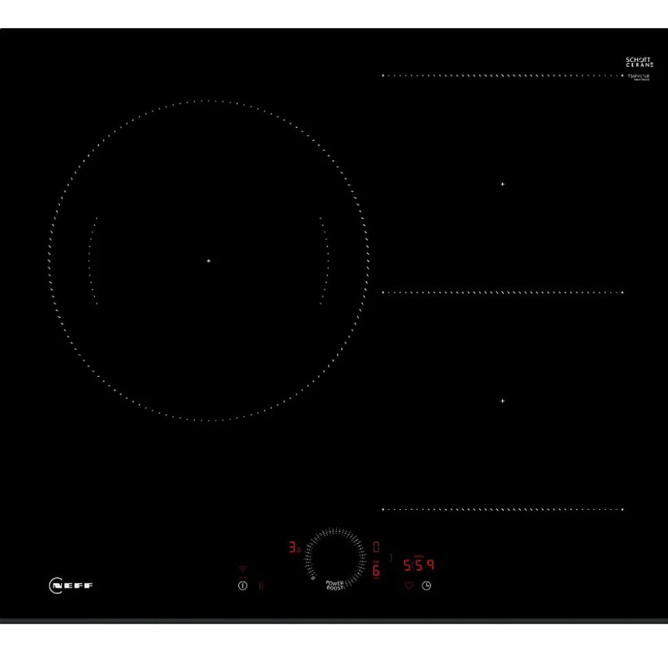 Table de cuisson induction 60cm 3 feux 7400w noir Neff – Plaque de cuisson à induction Combi autonome N70 Neff T56FHL1L0 avec commande Twist Touch. Combi Induction : regroupez deux zones de cuisson circulaires pour chauffer vos plus grands ustensiles de cuisson. Hotte contrôlable via la table de cuisson – commande pratique de la hotte par la plaque de cuisson. Power Boost : boostez la puissance de vos plaques quand vous avez besoin de chauffer plus vite. Induction : la chaleur est générée directement dans la casserole pour une cuisson précise qui s’arrête dès que le courant est coupé. – Type de produit : Table de cuisson induction.Nombre de foyers : 3.Témoin de chaleur résiduelle : Indépendant.Emplacement du bandeau de commande : Devant de la table.Matériau de base de la surface : Vitrocéramique.Couleur de la surface : Noir.Brûleurs : Non.Fonction boost pour les casseroles : Toutes les zones de cuisson.Puissance du 2nd foyer : 3 kW.Puissance de raccordement : 7400 W.Tension : 220-240 V.Fréquence : 50-60 Hz.Niche d’encastrement : 51 x 560-560 x 490-500 mm.Dimensions appareil H x L x P : 51 x 592 x 522 mm.Poids net : 10,9 kg.