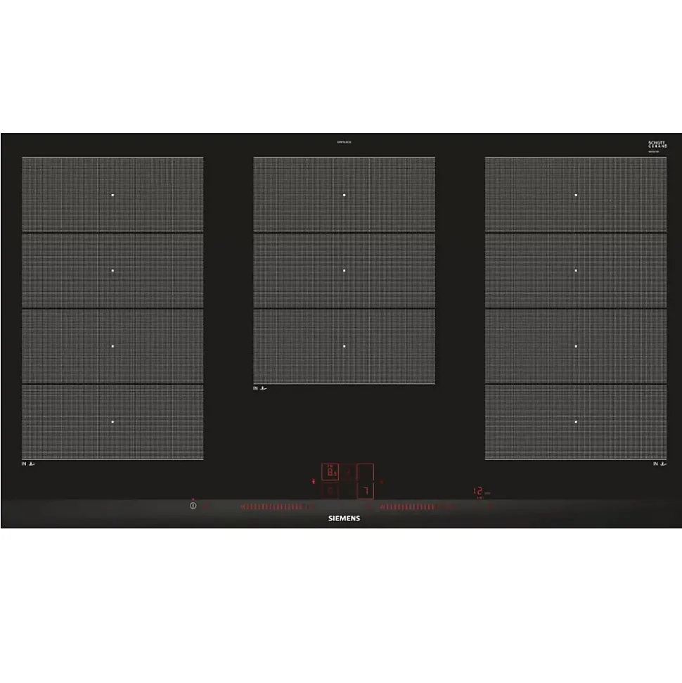Table de cuisson induction 90cm 5 feux 11100w noir Siemens – Table de cuisson à induction iQ700 de Siemens EX975LXC1E. La table flexInduction : pour plus de flexibilité lorsque vous cuisinez.FlexInduction : la zone de cuisson intelligente qui s’adapte à la taille de vos casseroles.Bandeau dual lightSlider : contrôlez la cuisson du bout des doigts.FryingSensor Plus : ne faites plus jamais brûler vos aliments.PowerMove Plus : réglages prédéfinis pour cuisiner en 3 étapes.FlexZones intelligentes : transfert automatique des réglages pour un maximum de liberté en cuisine. – Type de produit : Table de cuisson.Type : Plaque à induction.Gamme : iQ700.Nbre foyer(s) : 5.Type de commande(s) : Bandeau dual lightSlider.Emplacement des commandes : Frontales.Zone de cuisson modulable (flex) : Oui.Type(s) de zone(s) modulable(s) : 3 zones FlexInduction.Foyer le + puissant (W) : 2600.Foyer le + puissant avec booster (W) : 3700.Matière de la surface : Vitrocéramique.Type de cadre : Alu brossé.Appellation produit/famille : Foyer en vitrocéramique.Design : Encastrable.Type d’énergie : Électrique.Nombre de foyers : 5.Emplacement du bandeau de commande : Devant.Hotte intégrée : Non.Connecté : Non.Nbre de positions de cuisson : 17.Booster(s) : Oui.Minuteur : Oui.Affichage de la consommation énergétique : Oui.Autre(s) fonction(s) : Maintien au chaud, PanBoost, PowerMove Plus, FlexMotion, QuickStart, ReStart, FryingSensor.Témoin(s) de chaleur résiduelle : Oui.Verrouillage des commandes / Sécurité enfant : Oui.Anti-surchauffe : Oui.Détection de casseroles : Oui.Autre(s) sécurité(s) : Touche nettoyage, Interrupteur principal.Puissance de raccordement (W) : 11100.Tension (V) : 220-240.Fréquence (Hz) : 50/60.Longueur du cordon (m) : 1.1.Epaisseur min. plan de travail (mm) : 16.Couleur :