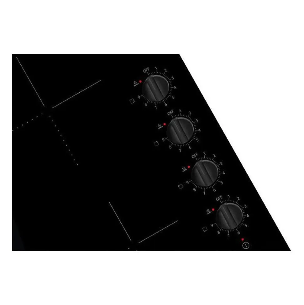 - Table vitrocéramique encastrable 4 foyers, surface noire lisse, commandes manettes à droite, 9 niveaux de puissance