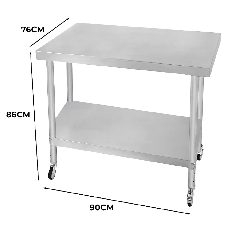 Améliorez la fonctionnalité de votre cuisine commerciale avec cette table de travail en inox de 76cm x 90cm x 86cm.Elle offre une surface robuste et spacieuse pour hacher, préparer et assembler – essentiel pour les établissements de restauration et de restauration très fréquentés.Fabriquée à partir d’acier inoxydable 201 de qualité supérieure, cette table offre une résistance et une durabilité exceptionnelles, ce qui lui permet de résister à une utilisation fréquente dans les cuisines commerciales exigeantes. La finition lisse facilite le nettoyage, parfait pour les environnements qui doivent maintenir un haut niveau d’hygiène alimentaire. Son aspect élégant et poli lui donne non seulement un aspect professionnel, mais se fondra également parfaitement dans les accessoires de cuisine environnants.Son étagère inférieure pratique offre une solution de rangement supplémentaire peu encombrante pour y stocker l’équipement et appareils de cuisine à portée de main. Bénéficiant de 3 positions de hauteur, chacune par incréments de 5cm, vous pouvez modifier l’unité en fonction des articles que vous choisissez de stocker. Le plateau et l’étagère inférieure offrent une capacité de poids remarquable de 80 kg, vous permettant de ranger facilement des objets lourds et d’effectuer des tâches en toute sécurité.Équipée de quatre roulettes, vous pouvez déplacer sans effort la table autour de votre espace de travail. Les roues offrent une maniabilité douce et facile, vous permettant de positionner la table là où c’est le plus pratique. De plus, avec deux freins, vous pouvez verrouiller la table en toute sécurité lors de son utilisation pour assurer une surface stable.De plus, la table est fournie avec 4 pieds ogives réglables, offrant encore plus de flexibilité. Les pieds et les roues interchangeables vous permettent de faire la transition de la table entre une utilisation mobile et stationnaire. La nature réglable des pieds non seulement