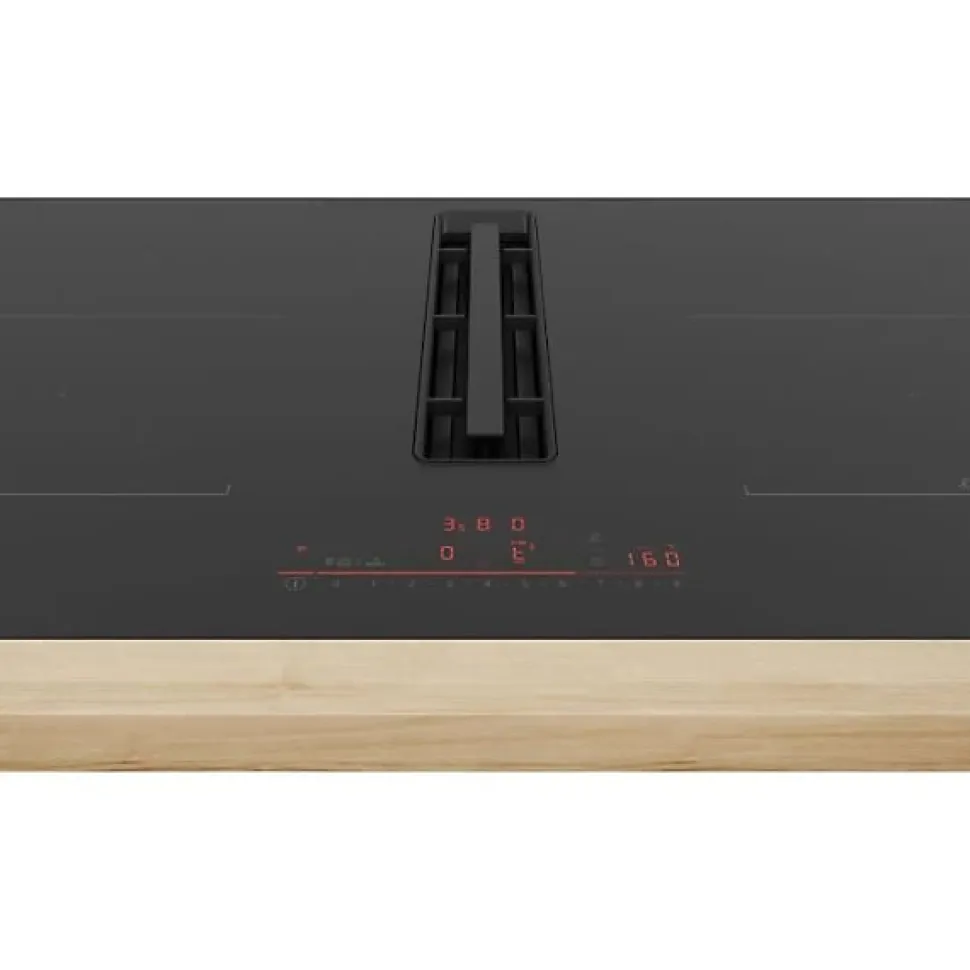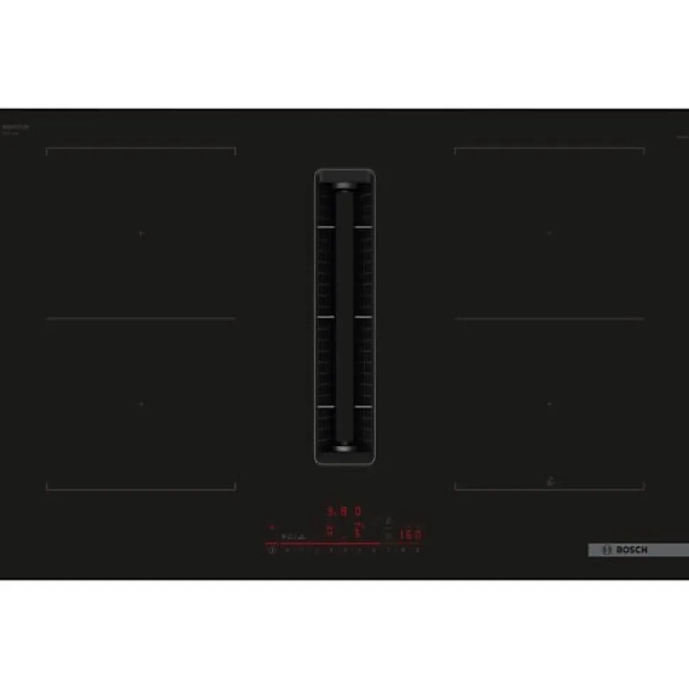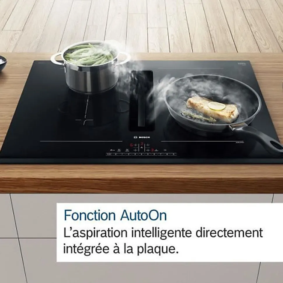 La table a induction aspirante Bosch de la Série 6, modele PVQ811H26E en noir, allie style et fonctionnalité pour une expérience de cuisine ultime. Avec une largeur de 80,2 cm et une profondeur de 52,2 cm, elle offre un espace de cuisson généreux pour répondre a vos besoins culinaires les plus exigeants.
