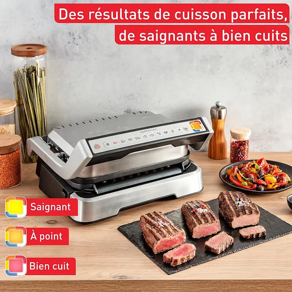 Le Tefal OptiGrill garantit des grillades parfaites, de saignantes à bien cuites, grâce à sa technologie intelligente qui mesure l’épaisseur des aliments et ajuste automatiquement le temps de cuisson. Son anneau lumineux indique clairement le niveau de cuisson, sans besoin de surveillance. Doté de 9 programmes automatiques pour viandes, poissons et légumes, il offre une polyvalence 4-en-1 : grill, barbecue, four et appareil de cuisson complet. Ses plaques antiadhésives et son bac récupérateur de graisse compatibles lave-vaisselle assurent un nettoyage facile. Réparable 15 ans au juste prix, il allie performance, praticité et durabilité.