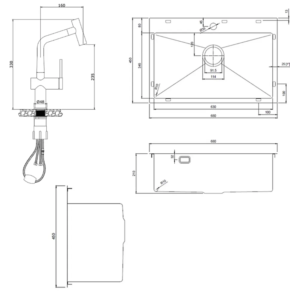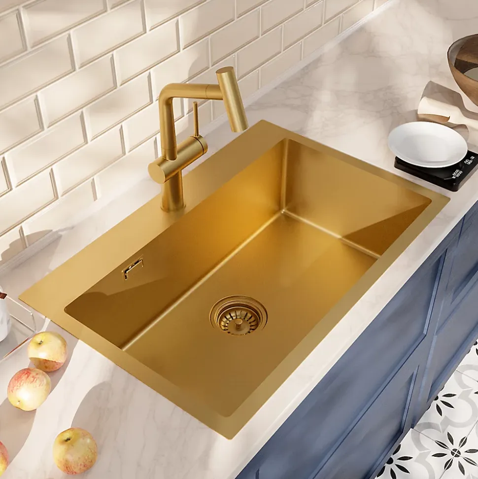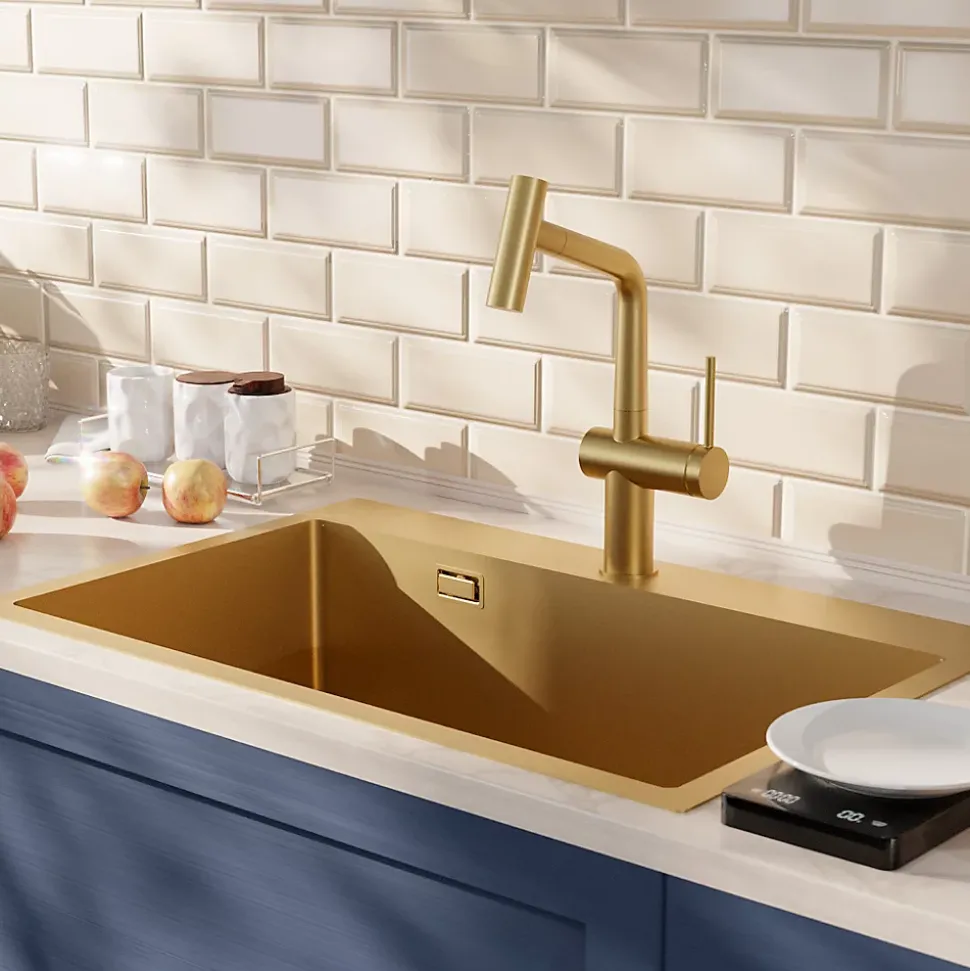 Caractéristiques de l’évier de cuisine encastrable 68x45x21 cm en inox 304, 1 bac + mitigeur d’évier à levier en acier inoxydable avec douchette extractible, monotrou, Ceramia Timeless, or brossé (TMLKST-6845BG-M1) :Ceramia Timeless Évier de cuisine encastrable inox 304, 1 bac , 68x45x21 cm, Or brossé PVDCeramia Timeless mitigeur d’évier à levier en acier inoxydable avec douchette extractible, monotrou, or brossé (TMLKF185BG)Timeless Évier de cuisine encastrable inox 304, 1 bac , 68x45x21 cm, Or brossé PVD :Matière: Acier inoxydable 304Coloris : Or brossé PVDDimensions: 68x45x21 cmÉpaisseur : 1,5 mmType d’installation : À encastrerAvec trop pleinTrou percé pour robinetterieDiamètre de la bonde : 90mmLivré sans siphonTimeless mitigeur d’évier à levier en acier inoxydable avec douchette extractible, monotrou, or brossé (TMLKF185BG) :Type de produit : mitigeur de cuisine Marque : CeramiaSérie : TimelessMatière : Acier inoxydable 304SUSColoris : orFinition : brosséType de mitigeur : à levier unique Type d’installation : monotrou, à poserHauteur de meuble sous vasque conseillé : 33 cmTypes de jets : Douchette 2 fonctions en acier inoxydable :Jet pluie (spray)Jet concentré (stream)Cartouche en céramique de marque Sedal (Espagne) de haute qualité Testée pour plus de 500 000 cycles d’ouverture/fermetureTuyaux d’alimentation eau chaude/froide en PEX certifié qualité alimentaireTuyau extractible en PEX alimentaire pour une utilisation sécurisée et flexibleConnecteurs rapides en PEX alimentaireLivré dans une boîte blanche avec mousse de protection