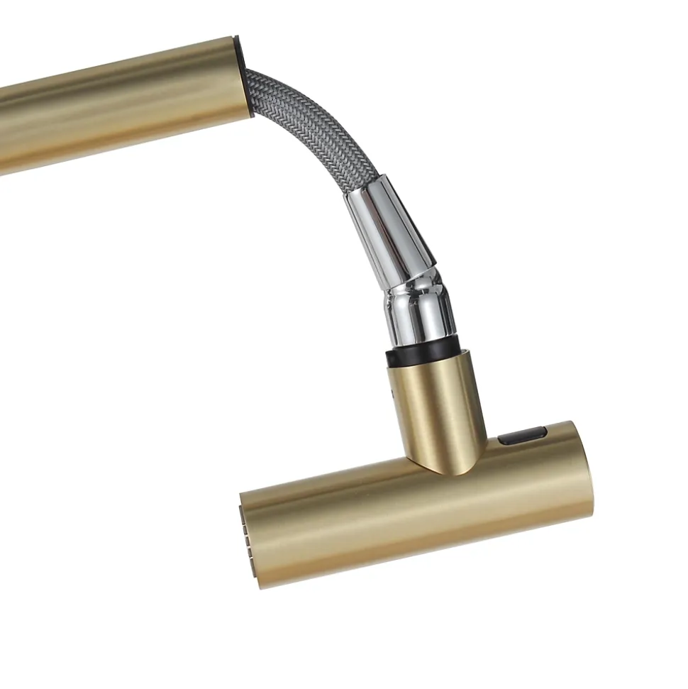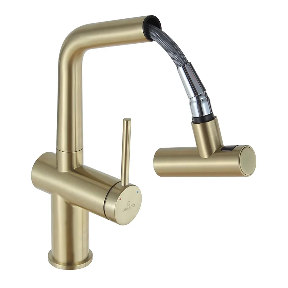 Caractéristiques du mitigeur d’évier à levier en acier inoxydable avec bec extractible, monotrou, Ceramia Timeless, or brossé (TMLKF185BG) :Type de produit : mitigeur de cuisine Marque : CeramiaSérie : TimelessMatière : Acier inoxydable 304SUSColoris : orFinition : brosséType de mitigeur : à levier unique Type d’installation : monotrou, à poserHauteur de meuble sous vasque conseillé : 33 cmTypes de jets : Douchette 2 fonctions en acier inoxydable :Jet pluie (spray)Jet concentré (stream)Cartouche en céramique de haute qualitéMarque SEDAL (Espagne)Testée pour plus de 500 000 cycles d’ouverture/fermetureTuyaux d’alimentation eau chaude/froide en PEX certifié qualité alimentaireTuyau extractible en PEX alimentaire pour une utilisation sécurisée et flexibleConnecteurs rapides en PEX alimentaireLivré dans une boîte blanche avec mousse de protectionVasque et meuble non fournis