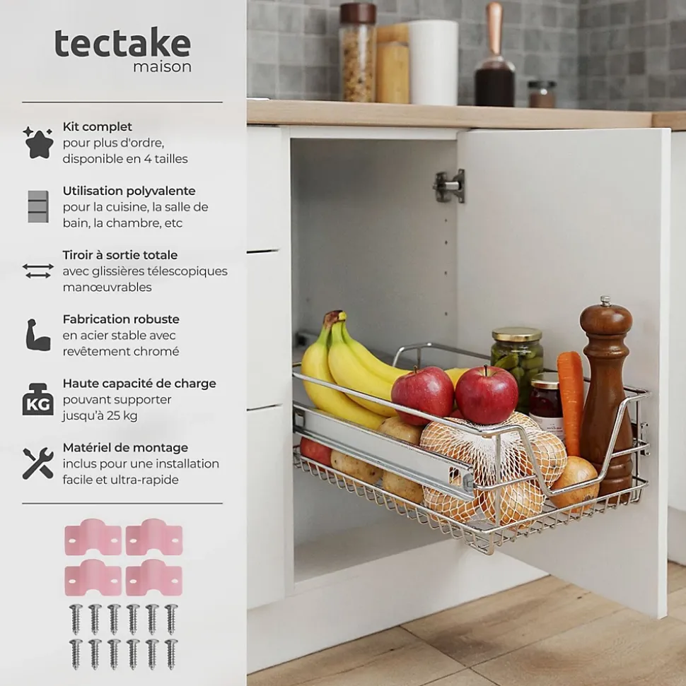 Tiroir de Rangement Télescopique en Métal, Panier Tiroir de Cuisine Coulissant – Armoire / Meuble TECTAKE. Ce tiroir de rangement télescopique polyvalent est parfait pour organiser ou ordonnancer votre cuisine, votre débarras, votre salle de bain, votre dressing ou votre placard de chambre à coucher. Ce produit très fonctionnel se décline en plusieurs tailles, il vous permet de créer des espaces de rangement astucieux et faciles d’accès. Fini la place perdue ! Il ne manquera pas de vous rendre votre quotidien plus agréable par son côté pratique.