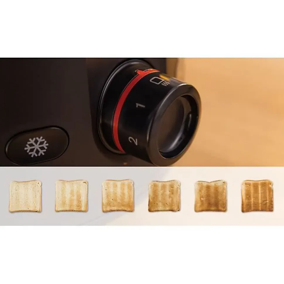 Grille-pain Bosch TAT2M123, 2 fentes, noir mat. Puissance 950 W, fonctions décongélation, réchauffage, thermostat rotatif 6 niveaux avec contrôle électronique, support viennoiseries pliable, centrage automatique, tiroir ramasse-miettes amovible, arrêt automatique en cas de blocage, rangement du cordon sous la base.