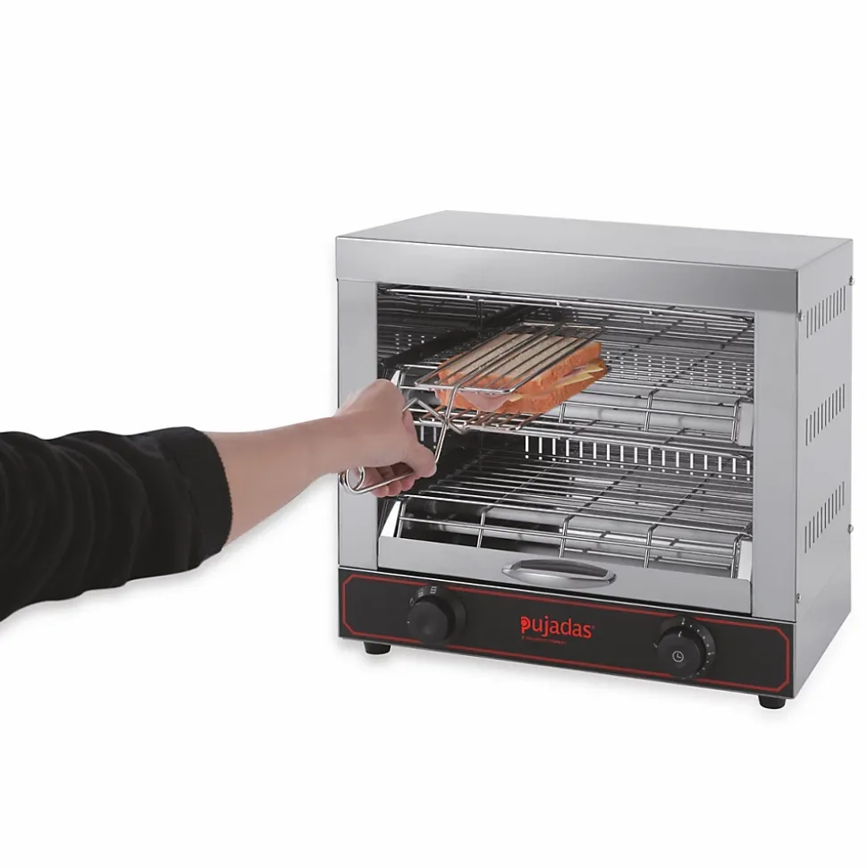Toaster professionnel de deux niveaux de cuisson doté d’une structure en acier inoxydable 18/10 résistante. Il est équipé d’une minuterie, d’un tiroir ramasse miettes et de 6 tubes quartz. Les résistances peuvent se contrôler séparément. Inclus 6 pinces à sandwich.Dimensions : L 44 x P 25 x H 44 cmCapacité : 120 à 130 tranches/heureMarque : Pujadas Tension : 230 VPuissance : 3000 W