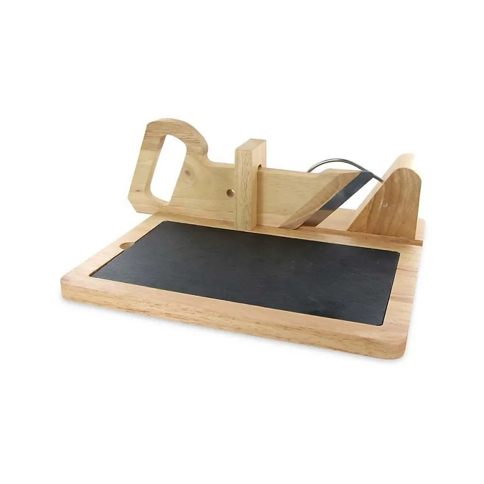 Aspect : Matériau principal = Bois • Matériaux secondaires = Ardoise Inox • Dimensions : Hauteur (en cm) = 11,80 • Longueur (en cm) = 29,20 • Profondeur (en cm) = 28,20 • Autres caractéristiques : Informations complémentaires = Permet de trancher charcuterie et fromages jusqu’à 6 cm de diamètre Planche de présentation en ardoise amovible Avec une goupille de sécurité • Poids (en kg) = 1,70 • Trancheuse à charcuterie avec plateau ardoise