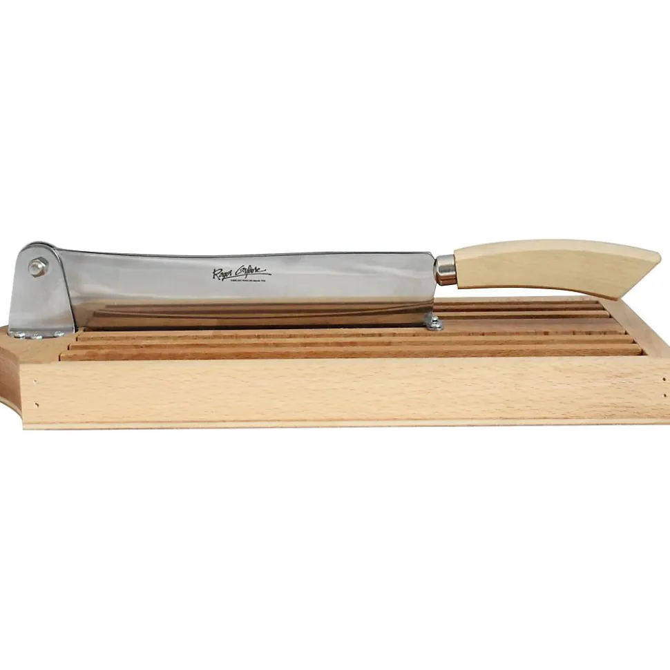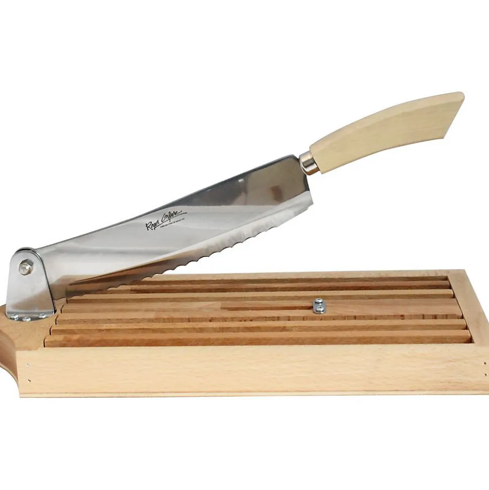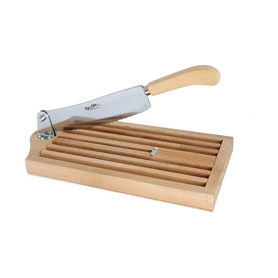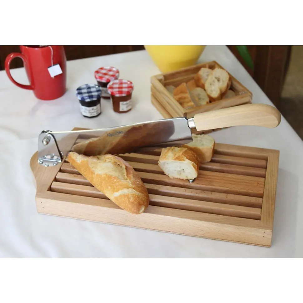 Aspect : Finitions = Huilé • Matériau principal = Hêtre • Matériaux secondaires = Inox • Dimensions : Hauteur (en cm) = 8 • Longueur (en cm) = 39,50 • Profondeur (en cm) = 19,00 • Autres caractéristiques : Informations complémentaires = Lame inox crantée 25cm Fabriqué en France • Poids (en kg) = 1,19 • Trancheuse à pain avec ramasse miettes en hêtre huilé