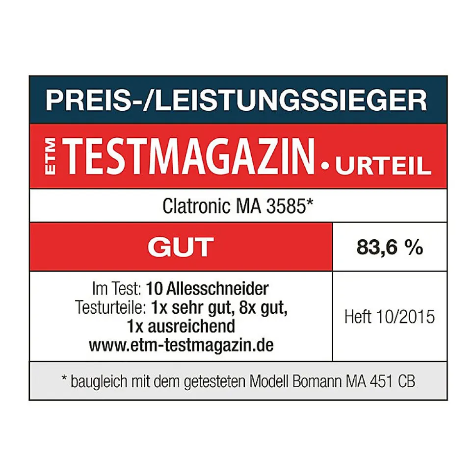 Grande lame en acier inoxydable (Ø 190 mm), antirouilleLame dentelée universelleBoîtier du moteur : aluminium moulé sous pressionInterrupteur marche/arrêtRail de guidage métalliquePlanche de guidage métalliquePoignée alimentaire avec protection des doigtsÉpaisseur de coupe réglable en continu (0-15 mm)Table d’appui inclinée avec insert en acier inoxydable,inclinable pour un nettoyage facileSupport sécurisé grâce aux pieds à ventouse220-240 V, 50/60 Hz, 150 W
