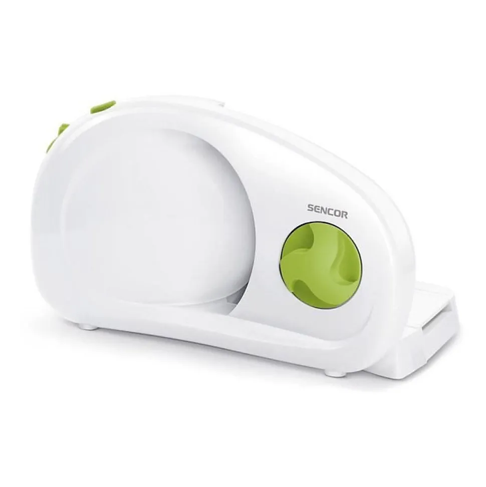 Trancheuse électrique SENCOR SFS 1001GR avec disque en acier inoxydable de 170 mm, réglage variable d’1 à 15 mm, base pliante et poussoir alimentaire retirables, puissance 100 W. Design compact et sécurisé, idéale pour usage domestique.