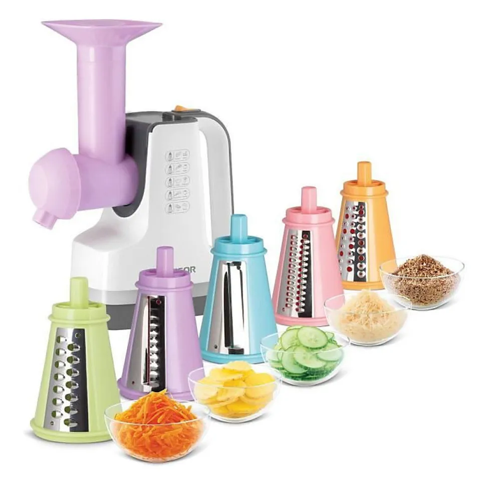 La trancheuse et râpe SENCOR SSG 4500WH allie polyvalence et praticité avec 6 fonctions en 1 grâce à ses accessoires interchangeables. Son tube d’alimentation large permet de travailler sans pré-découpe. La sorbetière intégrée prépare des desserts naturels rapidement. Le design compact avec pieds antidérapants garantit sécurité et facilité d’entretien. Puissance de 150 W avec fonctionnement silencieux.