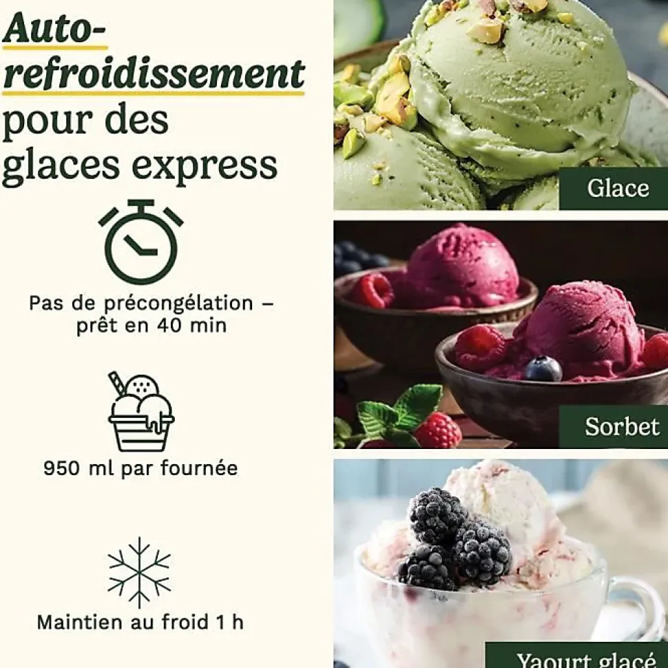 - Capacité 950 ml pour plusieurs portions ; glace prête en environ 40 minutes.
