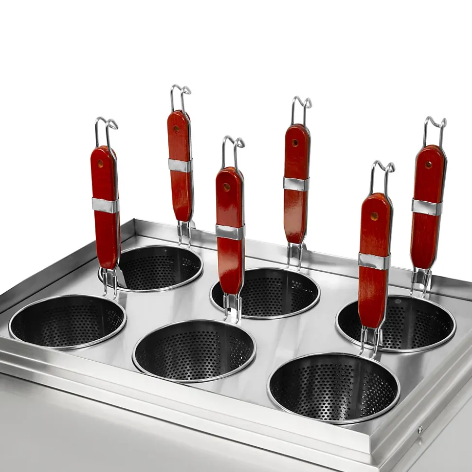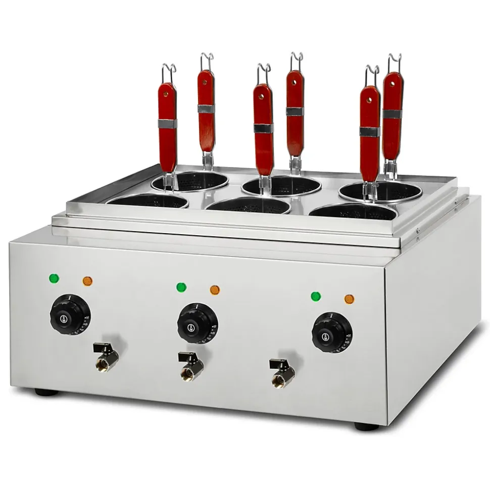 - COMPACT ET EFFICACE: avec trois cuves de 6 litres et quatre paniers, le cuiseur à pâtes VERTES allie une grande capacité à des dimensions compactes (550 x 590 x 280 mm). Cela permet de gagner une place précieuse et de cuire différents types de pâtes en parallèle.
