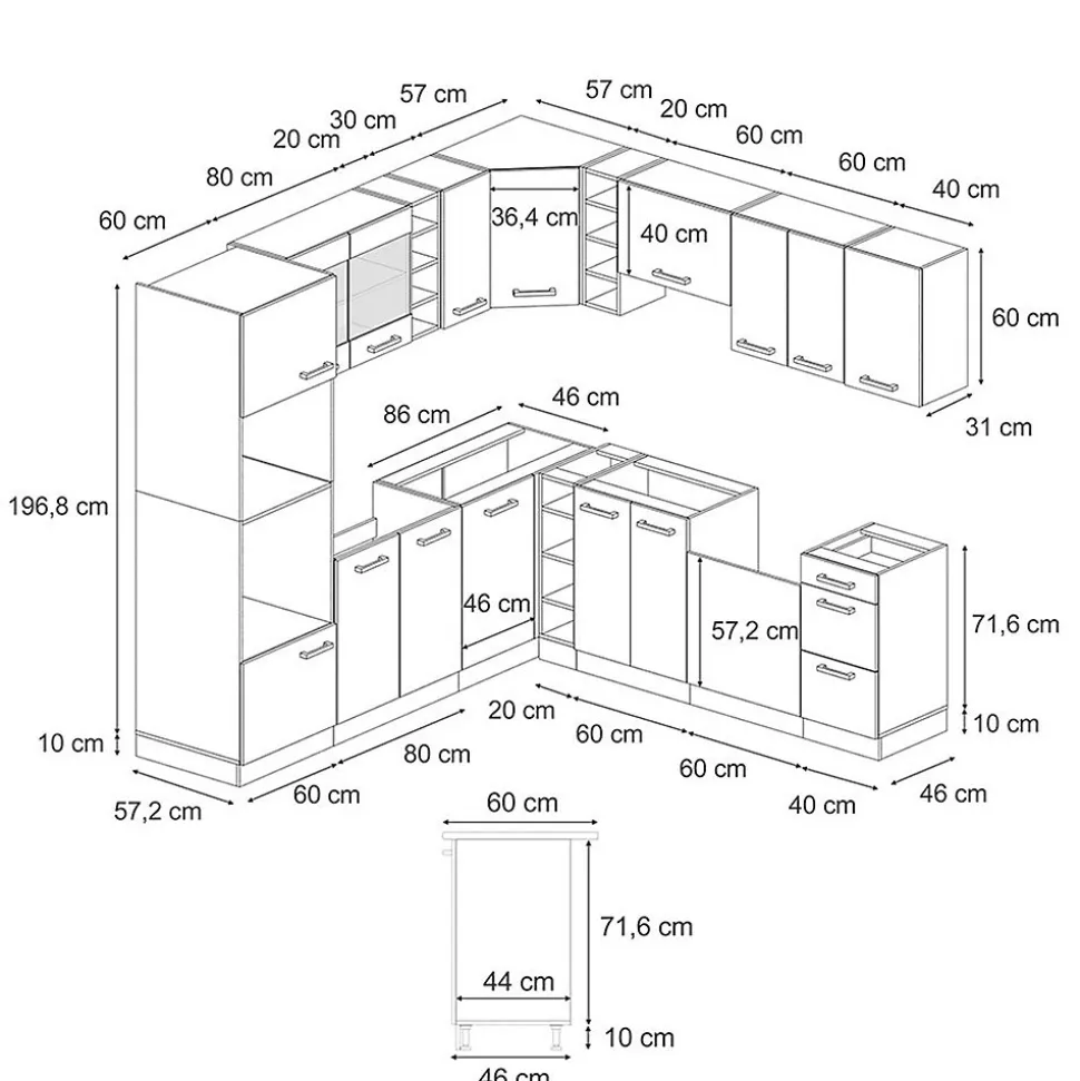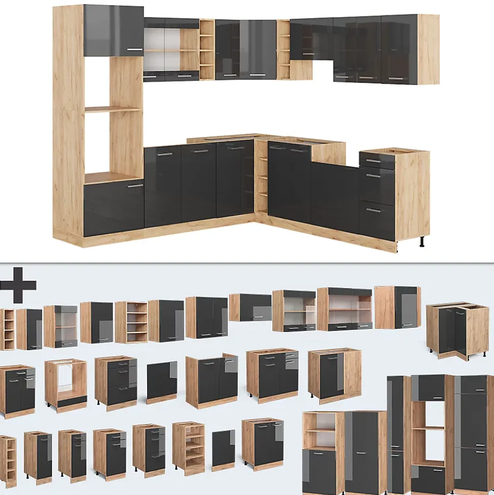 Les cuisines de la série R-Line se distinguent par un design optimal et une polyvalence universelle. En option, nous proposons également des panneaux de lave-vaisselle entièrement intégrés de la marque Vicco.Notre cuisine se compose de modules convertis à votre guise. Vous pouvez également obtenir des modules supplémentaires. Les pieds sont ajustables en hauteur pour un confort optimal.DIMENSIONS : La Cuisine en forme de L a une taille générale de 237×247 cm, la profondeur et la hauteur des modules inférieurs et supérieurs sont présentées sur les photos. Les meubles bas ont une profondeur de 46 cm.MATÉRIAU: La cuisine modulaire en angle est composée de panneaux de particules de 16 mm faciles à entretenir, avec un revêtement en résine mélamine.CONTENU DE LIVRAISON : bloc de cuisine avec plan de travail, matériel de montage, instructions de montage (sauf indication contraire, les appareils électroménagers et les décorations ne sont pas compris dans la livraison).