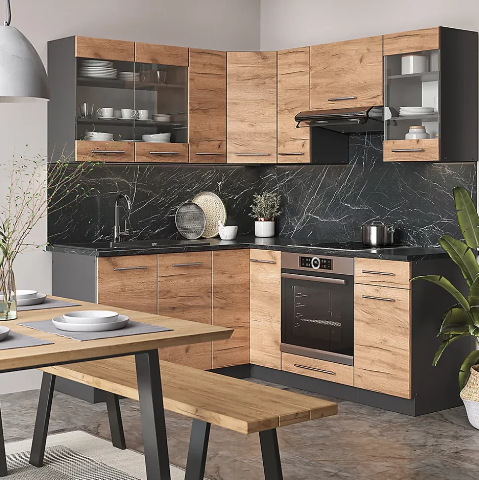 Les cuisines de la série Fame-Line offrent une qualité premium à des prix équitables. En option, nous proposons également des panneaux de lave-vaisselle entièrement intégrés de la marque Vicco.Avec « Fame-Line », choisissez entre des concepts de cuisine prêts à l’emploi ou élargissez-les à votre guise avec des modules supplémentaires.DIMENSIONS : La Cuisine en forme de L a une taille générale de 160×190 cm, la profondeur et la hauteur des modules inférieurs et supérieurs sont présentées sur les photos. Les meubles bas ont une profondeur de 51,6 cm.MATÉRIAU: La cuisine modulaire en angle est composée de panneaux de particules de 16 mm faciles à entretenir, avec un revêtement en résine mélamine.CONTENU DE LIVRAISON : bloc de cuisine avec plan de travail, matériel de montage, instructions de montage (sauf indication contraire, les appareils électroménagers et les décorations ne sont pas compris dans la livraison)