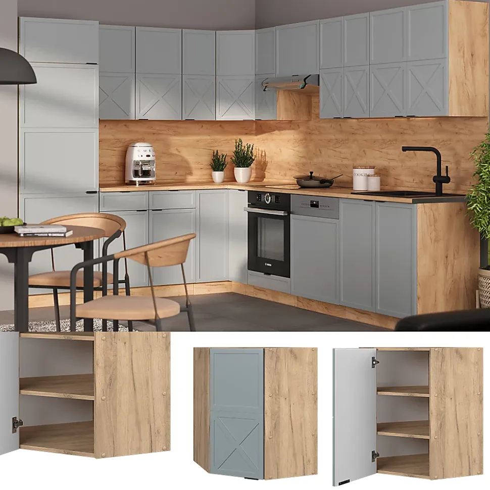 Les armoires de cuisine Fame-Line offrent une qualité premium avec des poignées métalliques solides, des charnières soft-closing pratiques et des coulisses métalliques à sortie totale à des prix raisonnables.Créez la cuisine de vos rêves : « Fame-Line » permet une composition individuelle à partir de différents modules.DIMENSIONS : Le Meuble cuisine d’angle mesure 57×57 cm – Largeur, 72 cm – Hauteur, 34,1 cm – Profondeur. Toutes les tailles détaillées sont indiquées sur les photos.MATÉRIAU: L’armoire de cuisine d’angle murale est composée de panneaux de particules de 16 mm faciles à entretenir, avec un revêtement en résine mélamine. Les façades sont fabriquées en MDF de haute qualité.CONTENU DE LA LIVRAISON: Meuble haut d’angle à monter soi-même (Remarque: la décoration n’est pas incluse dans la livraison), Instructions de montage, Matériel de montage