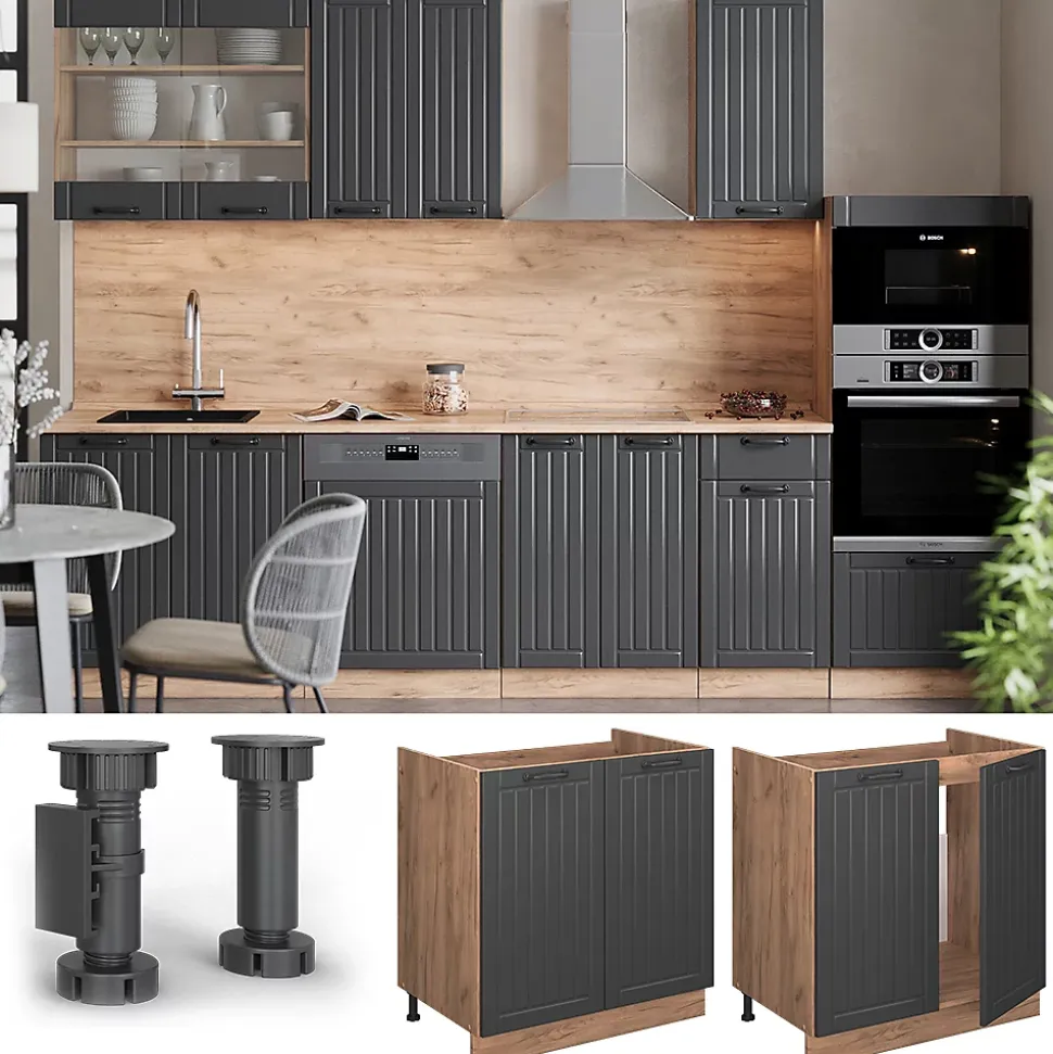 Fame-Line – Les armoires de cuisine offrent une qualité premium avec des poignées métalliques solides, des charnières soft-closing pratiques et des coulisses métalliques à sortie totale à des prix raisonnables.Le meuble bas de cuisine pour l’évier offre la possibilité d’ajouter des modules supplémentaires selon les besoins et de régler le module à sa guise.DIMENSIONS : l’armoire-évier a une largeur de 80 cm, une hauteur de 82 cm et une profondeur de 51,6 cm. Toutes les dimensions détaillées sont indiquées sur les photos.MATÉRIAU : le meuble de cuisine est composé de panneaux de particules de 16 mm d’épaisseur, faciles à entretenir et revêtus de résine mélamine. Les façades sont fabriquées en MDF de haute qualité.LIVRAISON : Armoire de cuisine en kit, instructions de montage, matériel de montage.