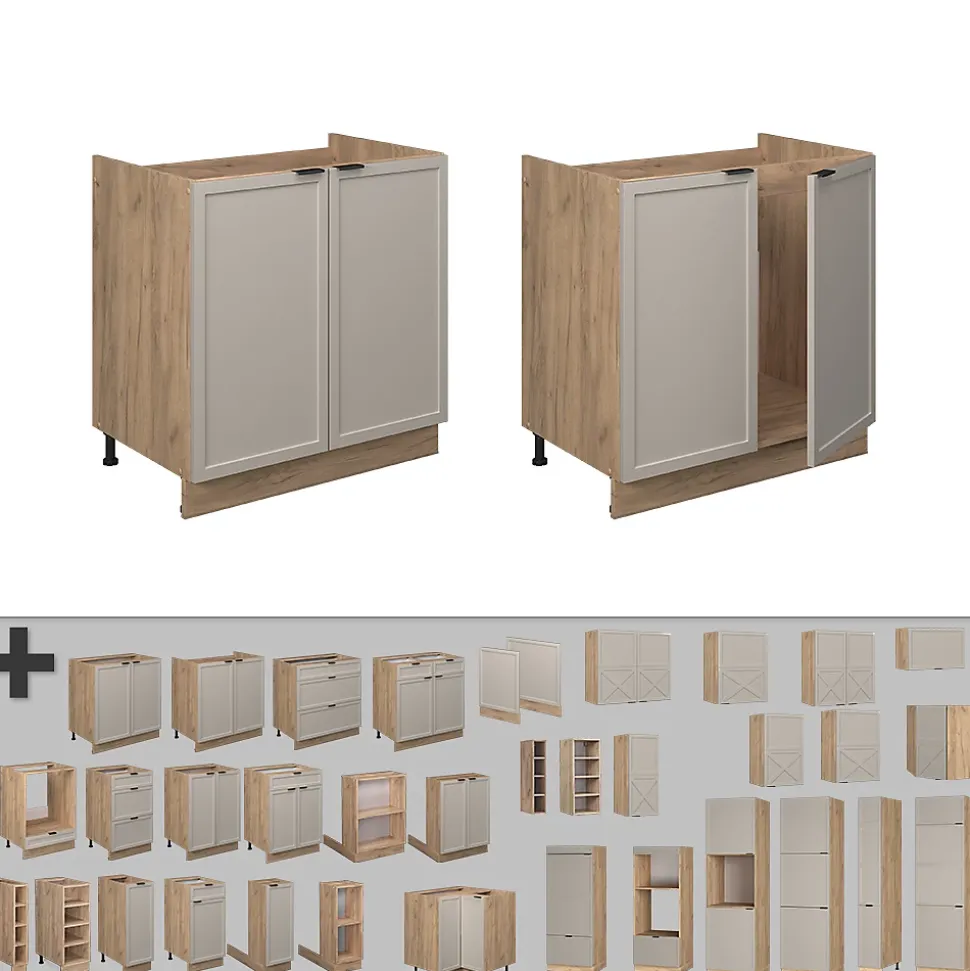 Les armoires de cuisine Fame-Line offrent une qualité premium avec des poignées métalliques solides, des charnières soft-closing pratiques et des coulisses métalliques à sortie totale à des prix raisonnables.Le meuble bas de cuisine pour l’évier peut être déplacé à volonté et offre la possibilité d’acquérir des modules supplémentaires. Les façades sont fabriquées en MDF.DIMENSIONS : Le Meuble sous-évier mesure 80 cm – Largeur, 82 cm – Hauteur, 60 cm – Profondeur. Toutes les tailles détaillées sont indiquées sur les photos.MATÉRIAU : le meuble de cuisine est en panneau de particules de 16 mm, facile à entretenir, avec un revêtement en résine de mélamine. Les façades sont fabriquées en MDF de haute qualité.LIVRAISON : Meuble sous évier avec plan de travail, matériel de montage, instructions de montage (Sauf indication contraire, les appareils électriques et les décorations ne sont pas inclus dans la livraison)