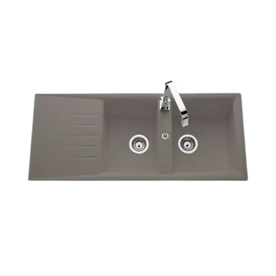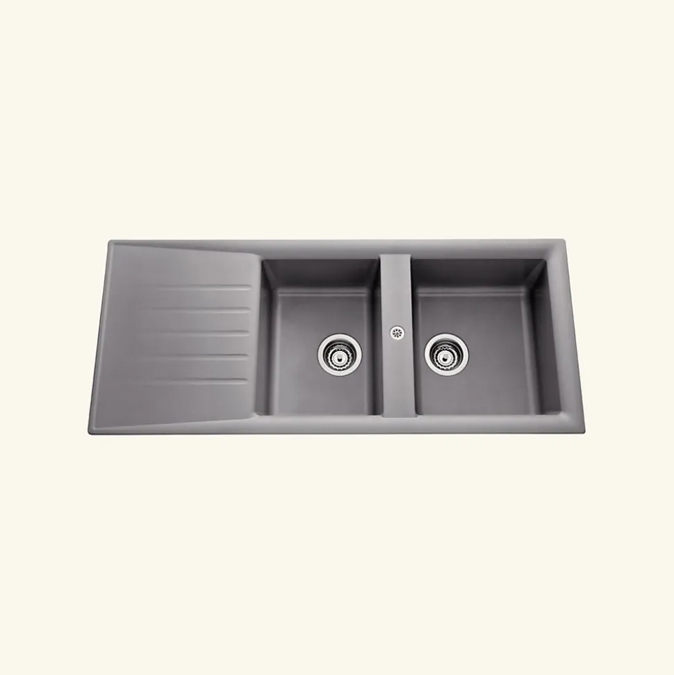<p•• Pour évier résine et granit •• Avec trop plein horizontal•• 2 bondes 90 cm •• Vidage manuel
