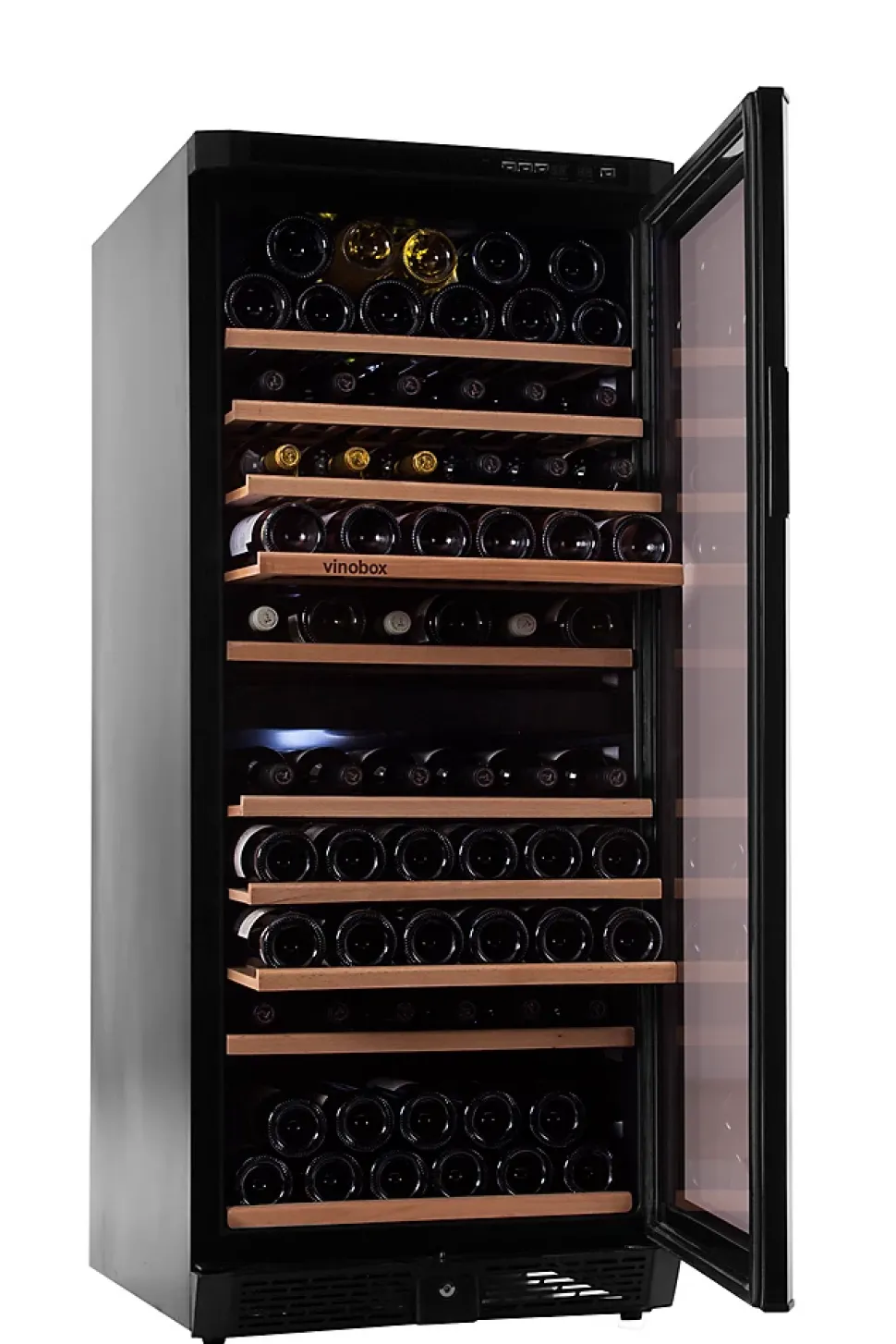 Vinobox 110 est une armoire à vin faites par des amateurs de vin pour des amateurs de vin, avec un design élégant et innovant. Aussi bon pour la consommation courante que pour la garde à long terme. La Collection Vinobox Grand Cru est une marque espagnole garantie 3 ans pour une tranquillité d’esprit. SPÉCIFICATIONS DE L’ARMOIRE À VIN VINOBOX 110Capacité de 110 bouteilles (selon disposition). Puissance : 210 W (260 kWh/an) – Classe G (ex Classe B). Volume de 132 litres. Température réglable de 5 à 18 ºC. Humidité constante ≥ 65 %.11 étagères amovibles en bois sur rails de sécurité. Porte triple-vitrée, isolante, réversible, traitée anti-UV. Affichage numérique de contrôle de la température avec voyant lumineux. Éclairage intérieur. Quatre pieds réglables en hauteur. Système No-Frost. Verrouillable. Froid par compresseur monté sur caoutchouc anti-vibrations et ventilé. Couleur noire. Cadre de porte : Noir59,5 cm de largeur sur 136cm de hauteur et 68cm de profondeur. Poids de 48 kg. Niveau de bruit faible (44 dB). Vinobox 110 a une garantie de 3 ans.