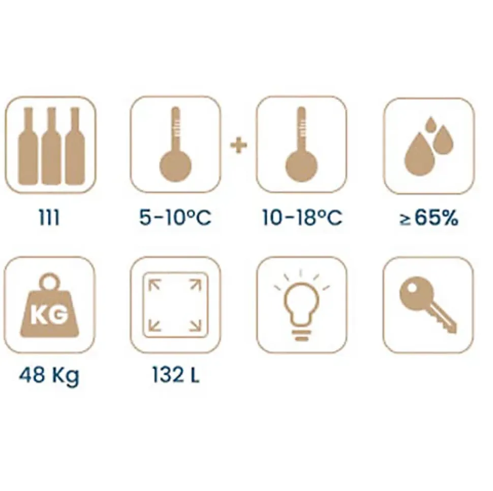 La cave à vin Vinobox 110 2 zones est une chambre de service pour de moyennes à grandes quantités de vin en garde. Parfait pour les professionnels, de par sa grande capacité et sa fiabilité, et pour les grands amateurs de vin qui souhaitent conserver leurs vins dans les meilleures conditions. 59,5 cm de largeur sur 136cm de hauteur et 68cm de profondeur.