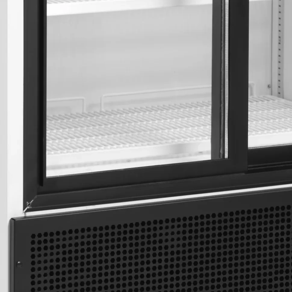 Mesures et contenuPlage de température+2 à +10 °CClasse climatique 4Poids brut / net 166 / 153 kgVolume brut / net707 / 462 lCanettes 330 ml 720 pcesCanettes 500 ml504 pcesBouteilles 330 ml360 pcesBouteilles 500 ml PET360 pcesDesign et matériaux Pieds4 pieds ajustablesRoulettes 4 roulettesFinition extérieure Blanc RAL9016Finition intérieure Acier peint en blancÉclairage intérieur LEDSerrure OuiNombre et type de porte 2 porte vitrée coulissante à fermeture automatiquePorte réversible NonNombre et type de tablettes 5 clayettes blanchesCouleur de tablette BlancDimensions des tablettes794 x 400 mmCharge max. par tablette196 kg/m²Type de caissonProfil en DFroid et fonctions Type de régulation ÉlectroniqueType de réfrigération VentiléType de dégivrage AutomatiqueFluide frigorigène R290Charge de gaz115 gThermomètre Oui Puissance et consommation Consommation d’énergie3.32 kWh/24hConsommation énergétique annuelle1212 kWh/anPuissance consommée410 WTension / Fréquence220-240/50 V/HzNiveau sonore48 dB(A)Dimensions Dimensions intérieures (LxPxH)810 x 561 x 1556 mmDimensions extérieures (LxPxH)890 x 740 x 1990 mmDimensions emballées (LxPxH)950 x 840 x 2160 mmCharge conteneur 40 pieds28 pces