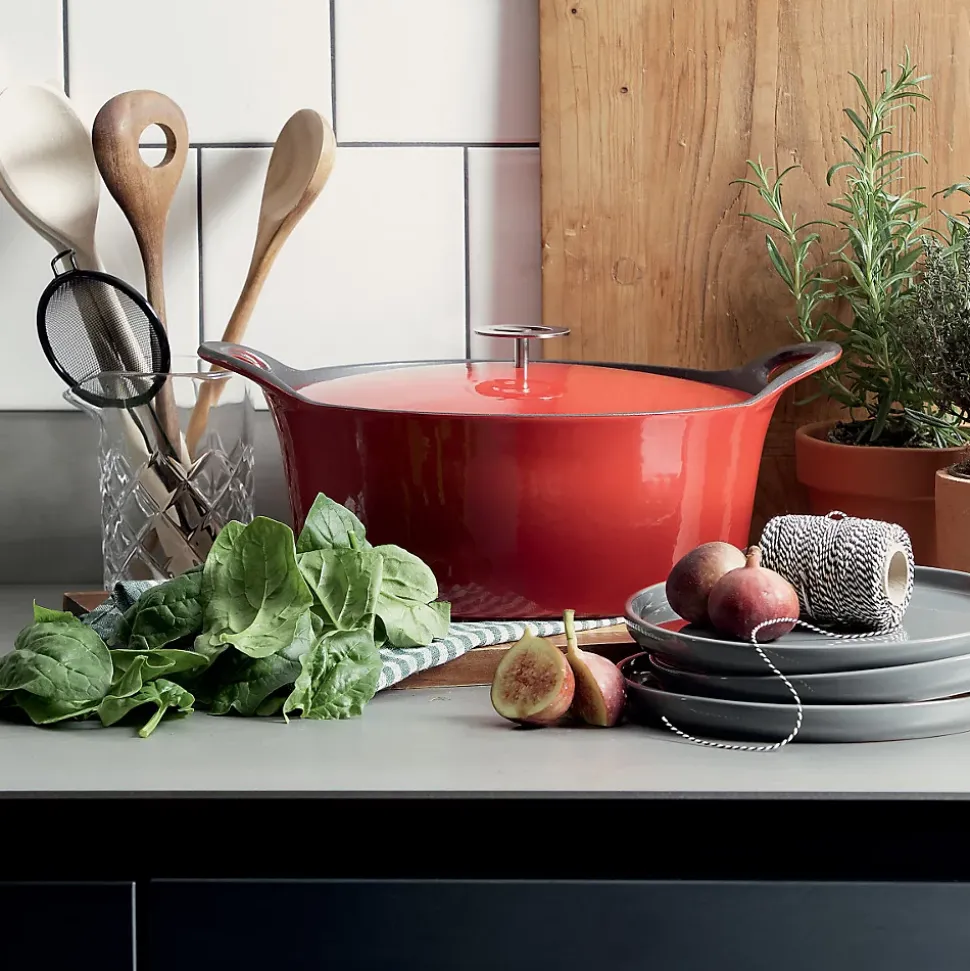- Cocotte ovale de diamètre 35cm. Fonte de fer émaillée de couleur rouge avec couvercle. Contenance 6 litres pour 8 à 10 convives.