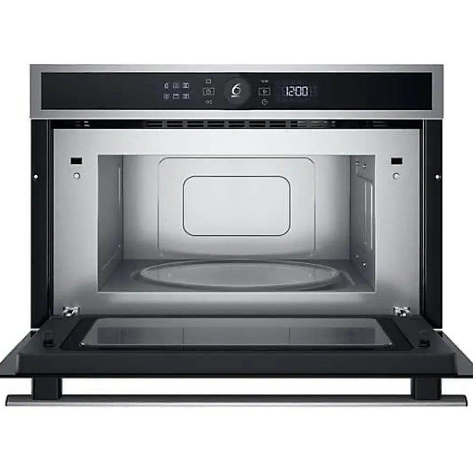 Micro-ondes combiné encastrable Whirlpool WMD4I4MXF 31 L en inox, avec fonction Crisp, grill quartz 800 W, technologie 6th Sense, JetDefrost et Jet Start pour une cuisson rapide et uniforme; auto-nettoyage par hydrolyse et intégration facile grâce à la ventilation frontale.