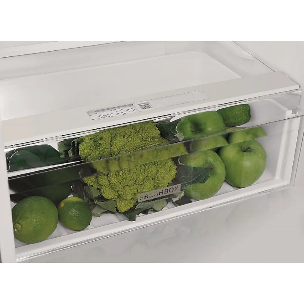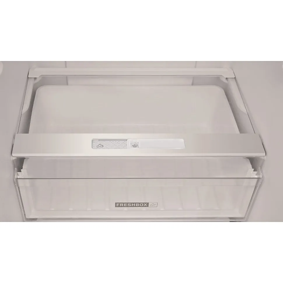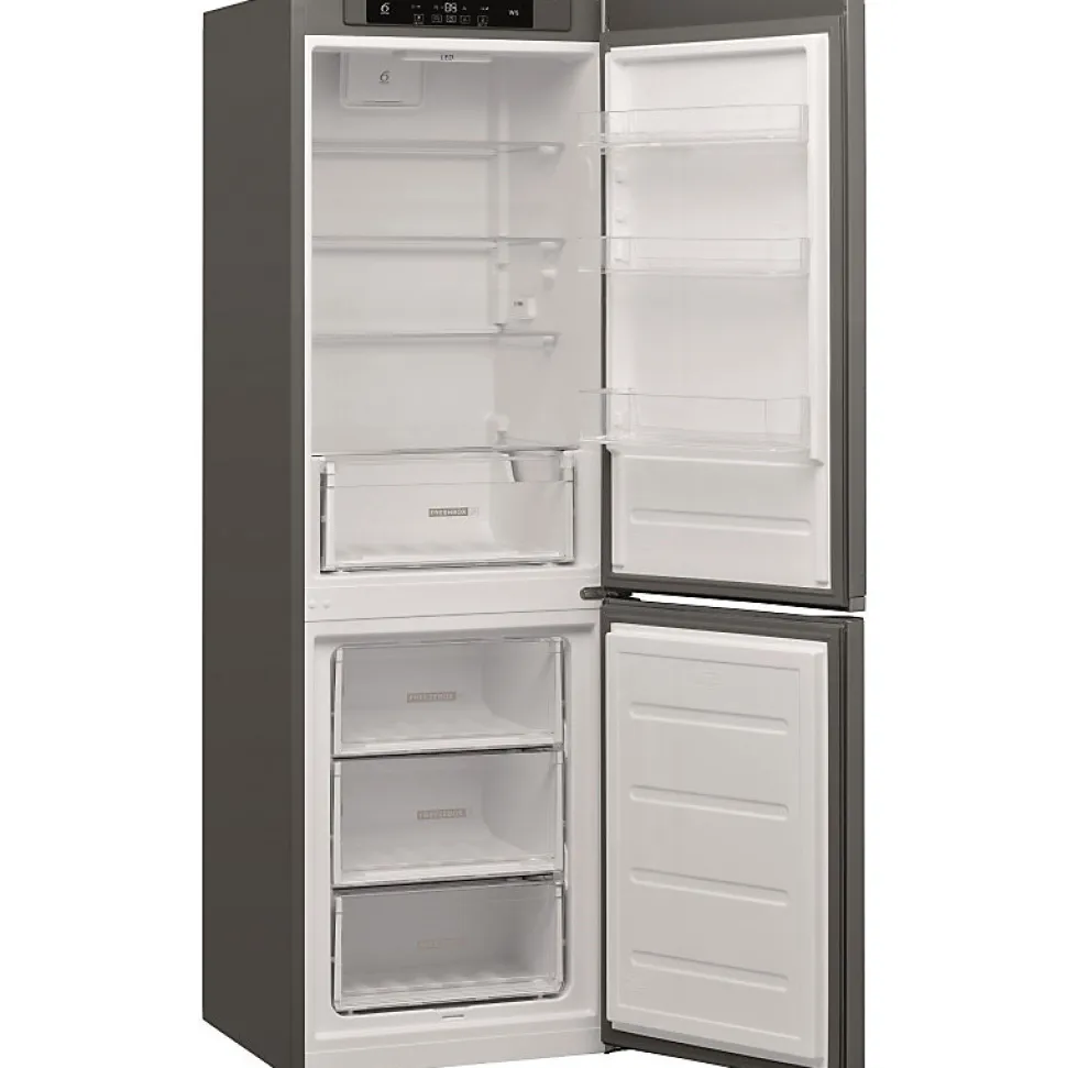 Réfrigérateur combiné Whirlpool W 5821 COX 2 avec une capacité totale de 339 L, technologie de froid brassé pour une meilleure conservation, classe énergétique E, dimensions compactes adaptées à toute cuisine, tiroir Freshbox, dégivrage automatique réfrigérateur, dégivrage manuel congélateur, faible niveau sonore 39 dB.