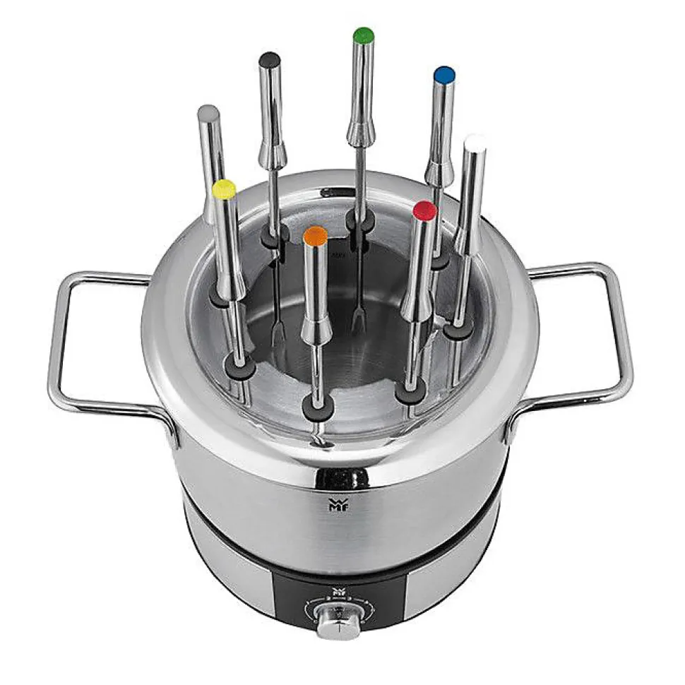 Cet appareil à fondue WMF LONO, avec son caquelon d’1,2 L et ses 8 fourchettes en acier inoxydable Cromargan est l’idéal pour une soirée conviviale et festive. Elégant et décoratif il possède des fourchettes marquées chacune d’une couleur différente qui ont leur propre emplacement dans le caquelon. Le régulateur de température et la puissance de 1400 watts permettent à l’huile ou au bouillon de chauffer rapidemen…