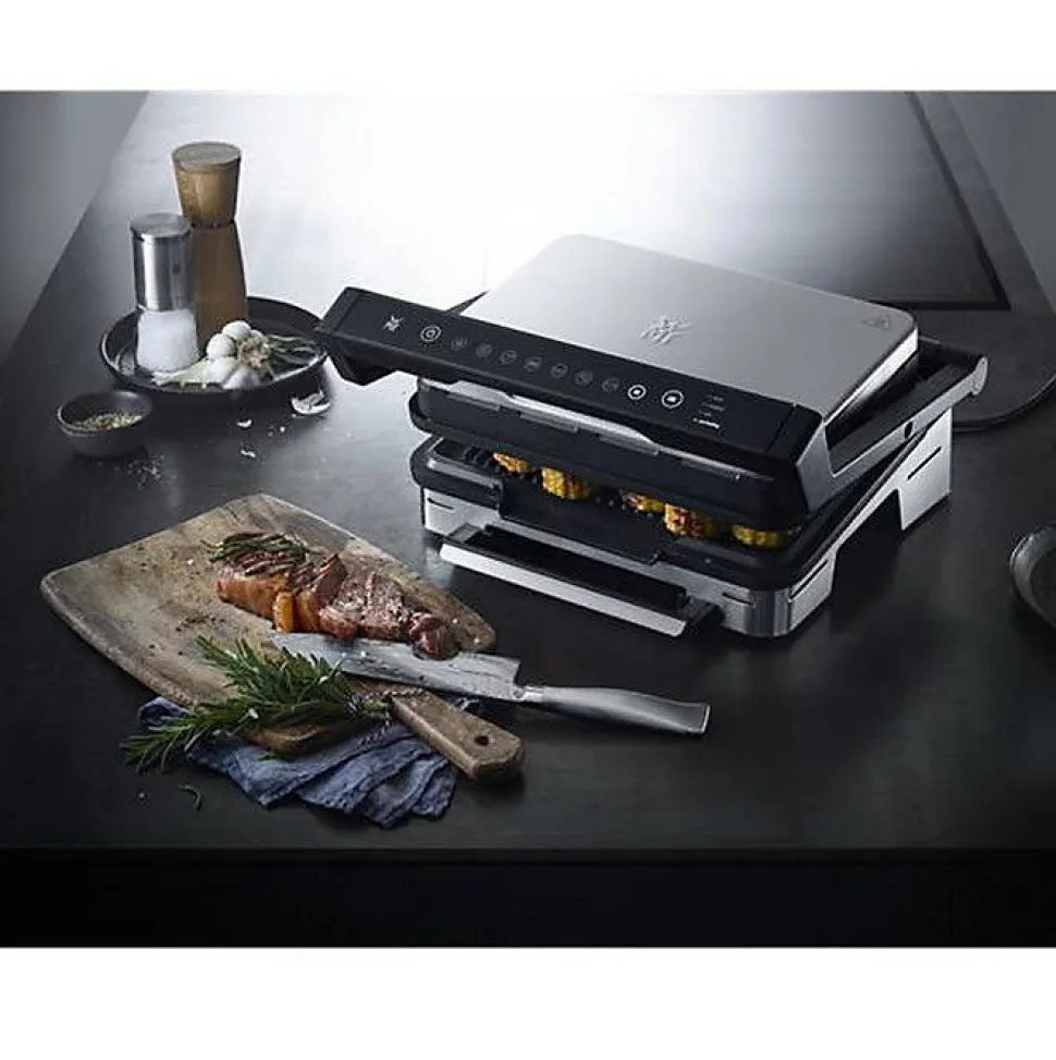 Grille-viande 2180w inox grille-viande profi plus perfection wmf 0415560011 : des performances de taille dans un design d’exception. Cette technologie de cuisson par capteurs automatiques brevetée ajuste la température et le temps de cuisson en fonction de la taille et de l’épaisseur des aliments. 6 programmes disponibles automatiques : steak, volaille, poisson, saucisse, burger et panini. Ecran tactile intuitif avec
