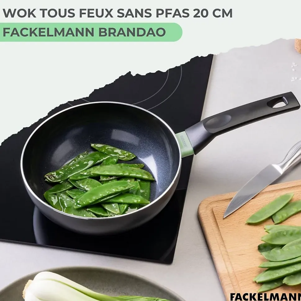 - DESCRIPTION : Wok Fackelmann Brandao de 20 cm en aluminium recyclé, revêtement céramique antiadhésif sans PFAS, compatible avec tous feux et résistant au four jusqu’à 150°C