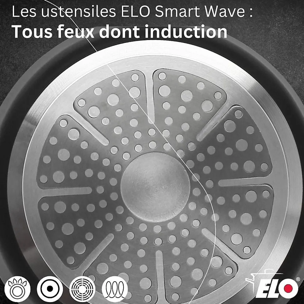 DESCRIPTION: Wok 24 cm avec revêtement antiadhésif ELODUR Select sans PFAS de haute qualité, en aluminium forgé, idéale pour réaliser de délicieuses recettes asiatiquesPETIT +: Les deux anneaux de dosage d’huile intégrés, et la structure alvéolée du fond de la poêle permettent une cuisson économe en matières grasses, pour des résultats de cuisson croustillants et sainsCOMPOSITION: En aluminium forgé et revêtement antiadhésif ELODUR Select, manche en plastique avec pare-feu métal, garantissant légèreté, longévité et performances antiadhésives optimalesDIMENSIONS: Wok 24 cm, Hauteur 7,5 cm, Fond 15 cm, Zone de cuisson 12 à 14,5 cm, 2 L circa ; parfait pour 2 à 3 personnesUTILISATION : Conçue pour tous les types de feux, y compris l’induction, les plaques vitrocéramiques, les plaques électriques et les cuisinières à gaz, ce wok sans PFAS est polyvalent et pratiqueENTRETIEN: Lavable au lave-vaisselle, pour un entretien simplifié au quotidienLa poêle Wok 24 cm Elo Smart Wave est la solution idéale pour les chefs à la recherche d’une cuisson simple et performante. Conçu en aluminium forgé, ce wok induction offre une excellente conduction de la chaleur pour une cuisson homogène. Son revêtement antiadhésif ELODUR Select, sans PFAS, garantit des résultats antiadhésifs impressionnants. La structure alvéolée du fond permet une répartition homogène de l’huile, favorisant une cuisson croustillante et peu grasse. Idéal pour la cuisine Chinoise, mais aussi pour réaliser des recettes familières : osso bucco, pâtes à la Bolognaise, ratatouille…Compatible avec tous les types de cuisinières, ce wok tous feux est robuste et facile à entretenir grâce à sa résistance aux rayures et à sa capacité de nettoyage au lave-vaisselle. Avec un design esthétique et un manche en plastique avec pare-flammes, il allie sécurité et confort d’utilisation.