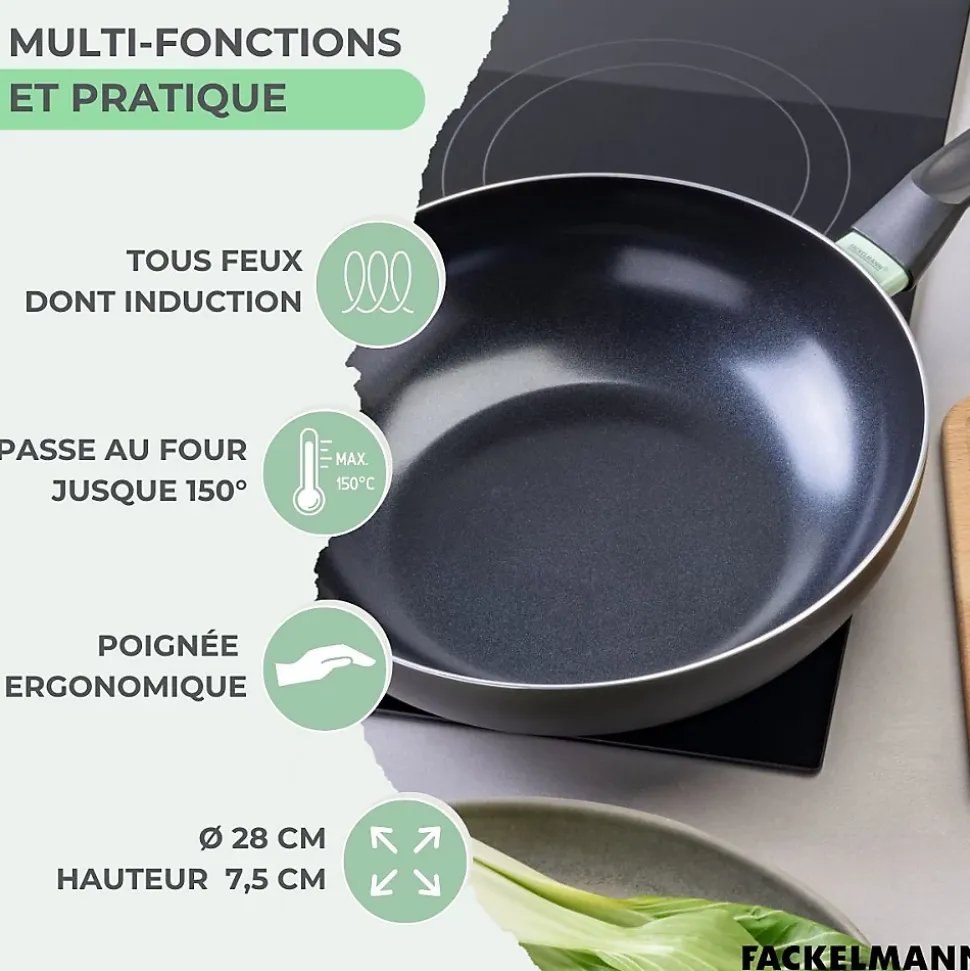 - DESCRIPTION : Wok Fackelmann de 28 cm en aluminium recyclé, revêtement céramique antiadhésif sans PFAS, compatible avec tous feux et résistant au four jusqu’à 150°C
