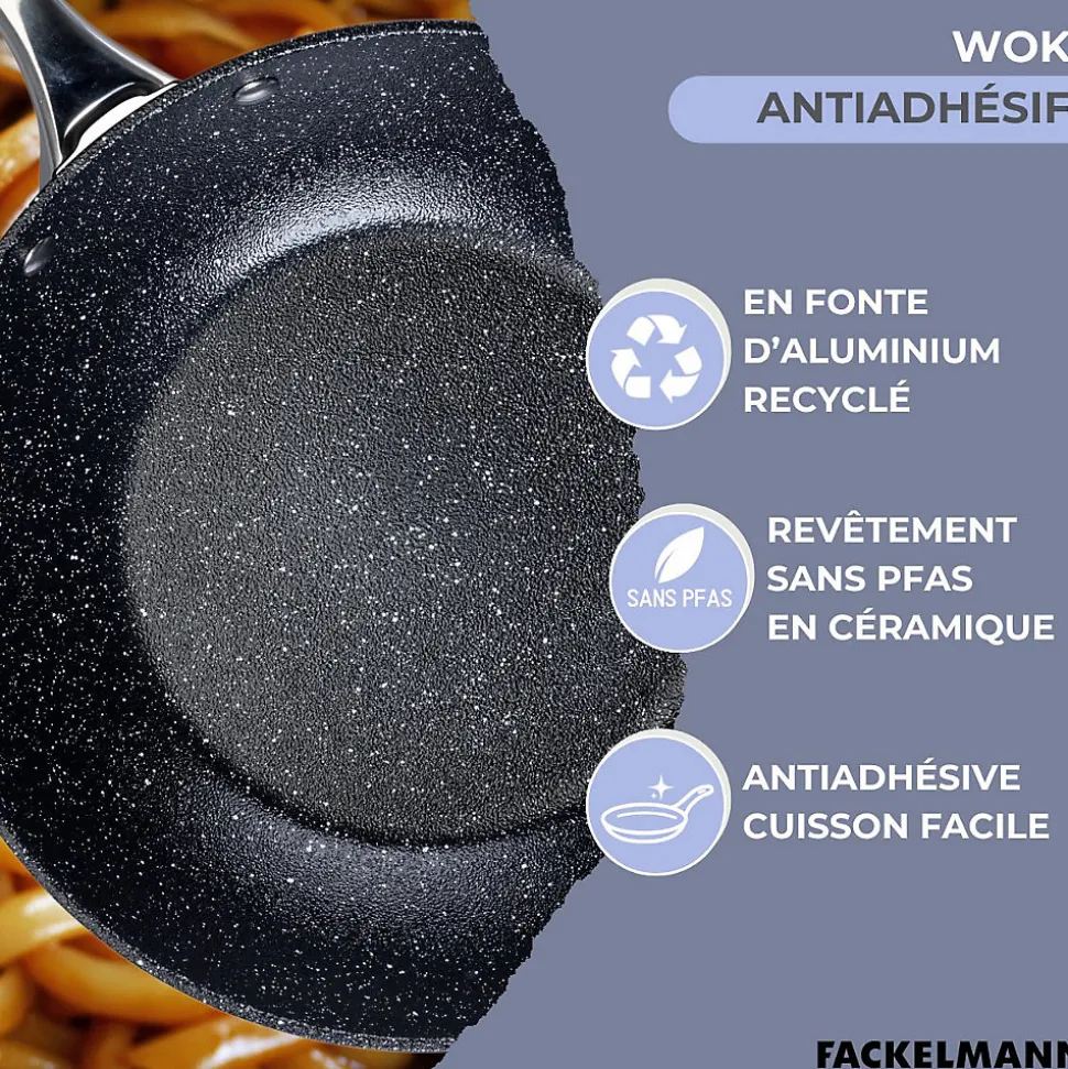 - DESCRIPTION : Wok Fackelmann Crossroad 28 cm en aluminium recyclé avec revêtement céramique antiadhésif sans PFAS ; tous types de feux et four