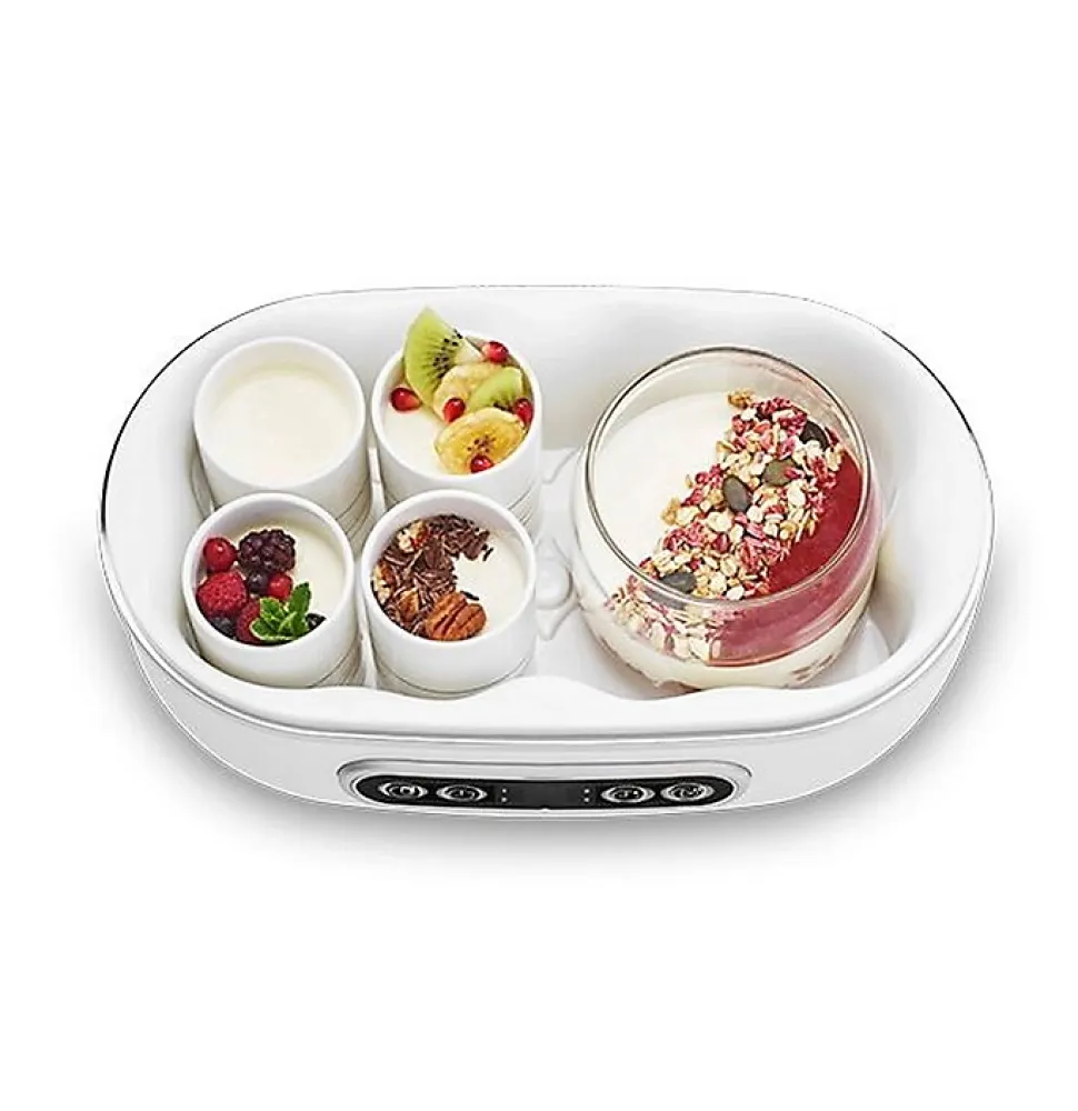 Yaourtière 8 pots 20w Simeo – Yaourtière 8 pots multi-préparations YVA640 de Simeo. Choisissez entre 4 modes de préparation automatiques. Mode CLASIQUE pour des yaourts à base de lait animal, lait de vache, de chèvre, de brebis…. Mode VÉGÉTAL pour préparer des desserts lactés à base de boisson au soja, aux amandes, à la noisettes, à la coco. Mode RAPIDE pour préparer des yaourts en 4 h, idéal pour les plus pressés. Mode DESSERT pour préparer crème au chocolat, au café, cheesecake…. Pour chaque mode, vous pouvez adapter la durée de fonctionnement afin d’ajuster la texture selon vos goûts. Réalisez jusqu’à 8 yaourts savoureux à la fois. Vos yaourts maison sont 100% naturels, sans colorants, stabilisateurs ou conservateurs.Des pots réutilisables qui vous permettent de réduire vos déchets ! Chauffe précise et stable qui garantit une texture parfaite et des saveurs délicates. Arrêt automatique une fois le temps de cuisson écoulé : pas de sur-cuisson qui rendrait les yaourts acides. Peu encombrante, son format compact occupe un petit espace sur votre plan de travail. Livret de 40 recettes gourmandes et variée. – Type de produit : Yaourtière.Fonction de la yaourtière : Yaourt, fromage blanc et crème dessert.Inclus 8 pots en céramique de 125 ml, compatibles lave-vaisselle et 2 pots en verre de 620 ml pour préparer des portions plus généreuse.Panneau de commande avec écran LCD indiquant le temps de cuisson restant.Arrêt automatique.Puissance : 20 W.Minuterie.Coloris : Blanc/noir.Dimensions (L x P x H) : 30 x 17 x 15.3 cm.