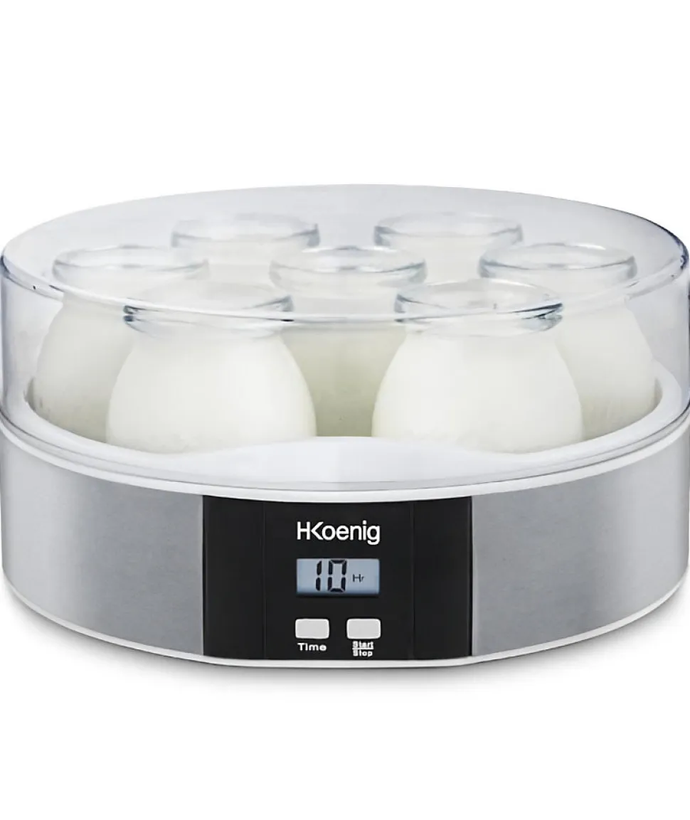Préparez facilement vos yaourts maison avec la yaourtière H.Koenig ELY70 : capacité totale 1,12 L (7 pots de 160 mL), écran LCD programmable jusqu’à 15 h, corps inox et couvercle transparent, 7 pots en verre compatibles lave-vaisselle, arrêt automatique et signal sonore en fin de cycle, puissance 15 W.