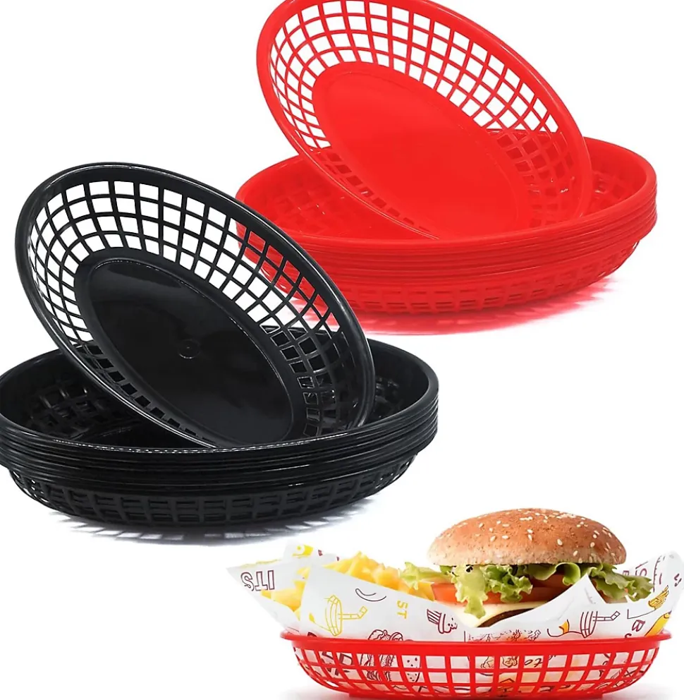 Servez facilement vos snacks, frites, pain ou friandises avec ce lot de 16 paniers alimentaires en plastique (8 rouges + 8 noirs). Parfaits pour les anniversaires, fêtes, pique-niques ou événements professionnels, ces paniers sont robustes, réutilisables et faciles à nettoyer, garantissant une utilisation durable. Leur design coloré et classique apporte une touche festive à vos présentations, tandis que les poignées confortables et bords lisses permettent un transport et un service pratiques. Idéal pour particuliers et professionnels, ce lot combine praticité, durabilité et style, rendant le service et la distribution de nourriture simple et élégant.