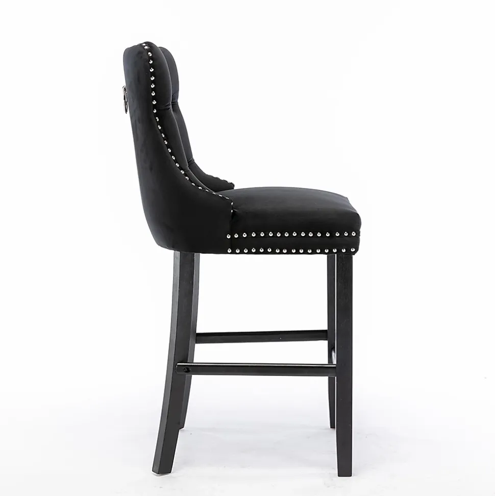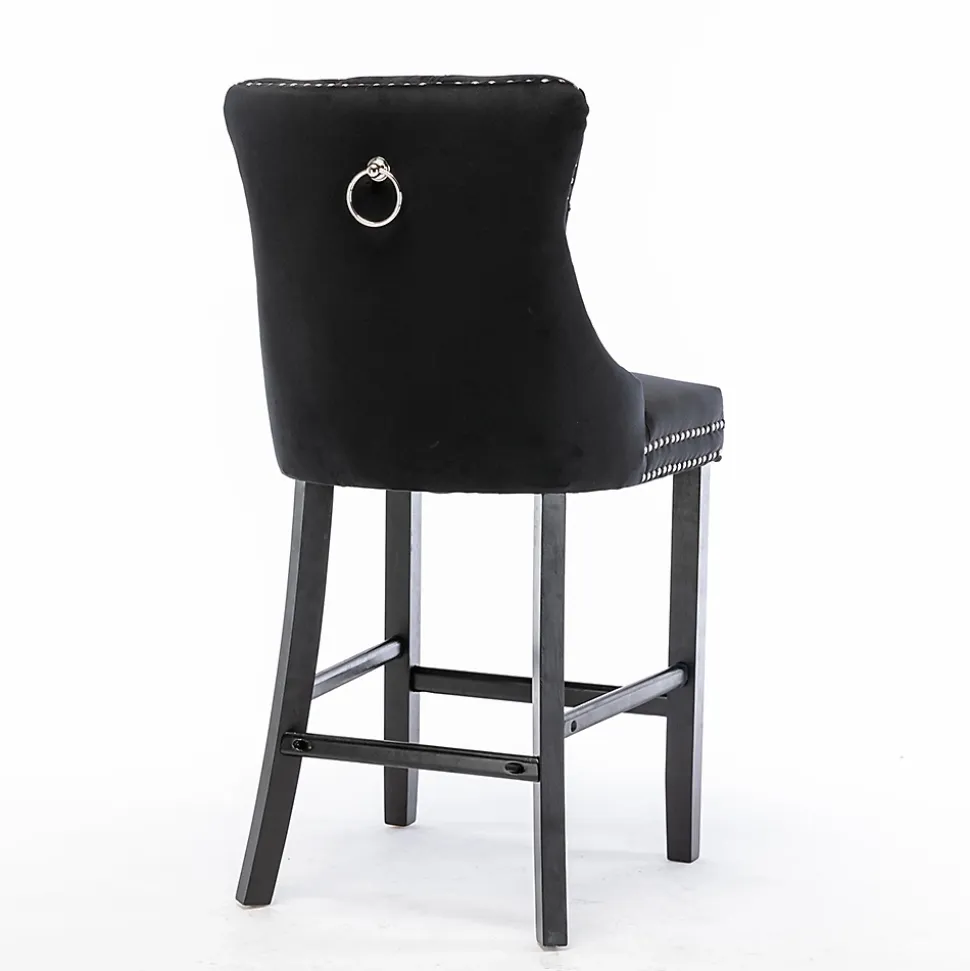 - Cet ensemble de tabourets de bar présente un design à dossier haut offrant un soutien lombaire robuste et confortable. Des rivets décoratifs ornent les coussins et le dossier, conférant une élégance noble tout en apportant une texture raffinée et luxueuse à l’ensemble.