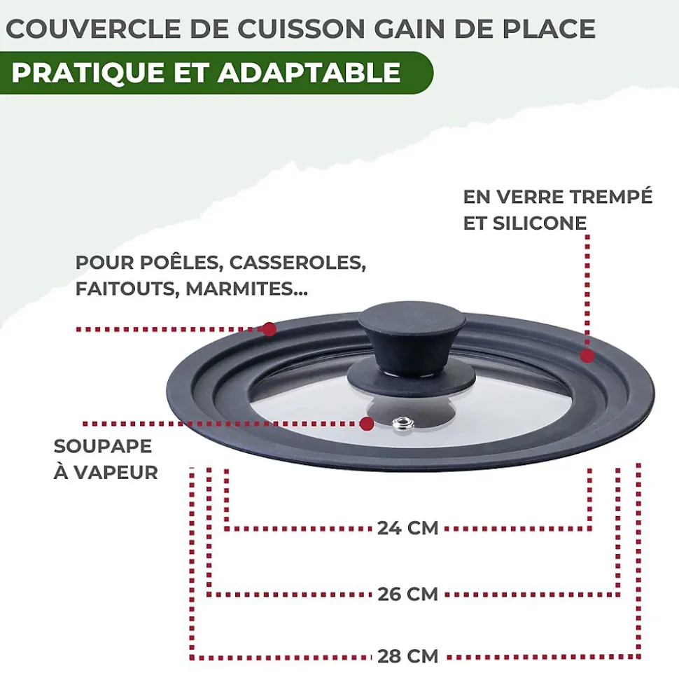 - PETIT +: Couvercle adaptable pour poêles de 24 à 28 cm, économisant l’espace et l’énergie
