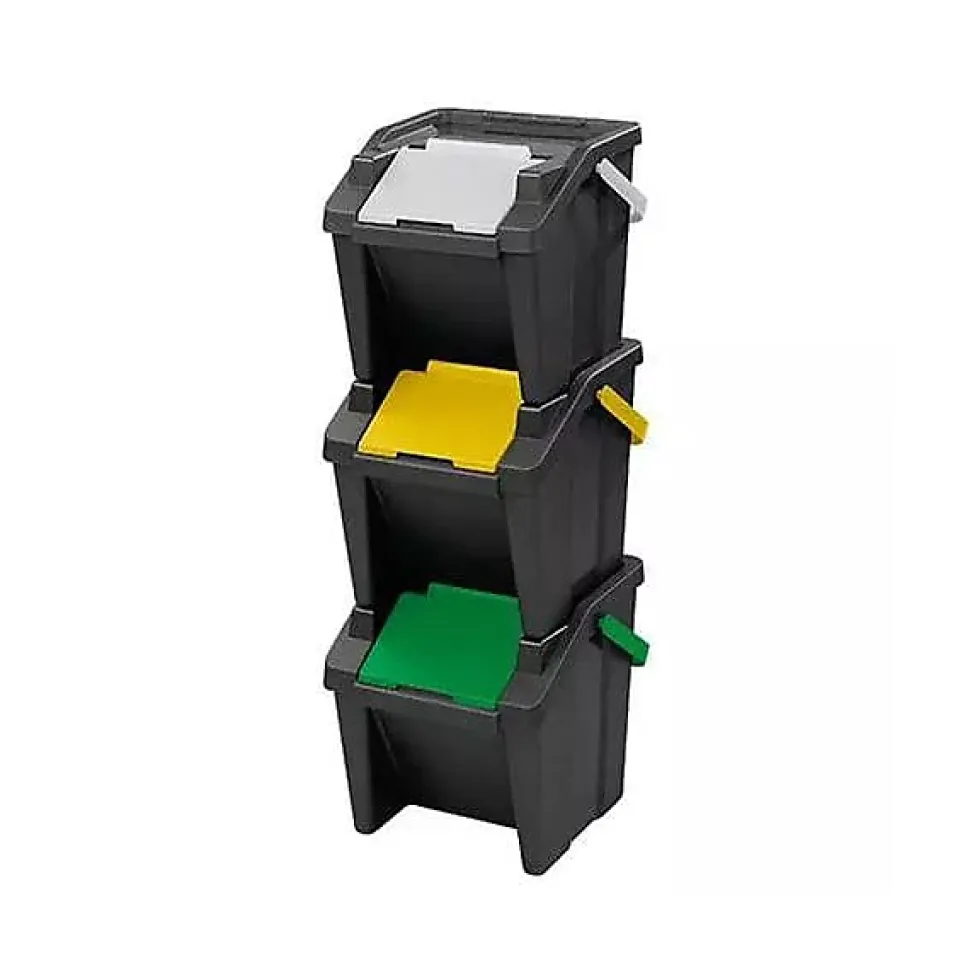 Système de tri des déchets Tower, lot de 3 Lot de 3 poubelles pour le tri des déchets: papier, plastique, déchets organiques, verre corps fabriqué à base de 80% de matériel recyclé empilable: parfait pour les petits espaces emboîtable : pour un volume réduit lors du transport et du stockage facile à vider et à transporter grâce à l’anse corps noir / couvercles et poignées de couleur: jaune, vert et blanc dimensions d’une poubelle : (L) 38,2 x (P) 37,6 x (H)37 cm hauteur totale quand les 3 poubelles sont empilées : 107 cm – pour collecter les déchets dans la cuisine, dans la cave ou dans le garage- pour collecter les déchets au bureau, dans la salle de pause café