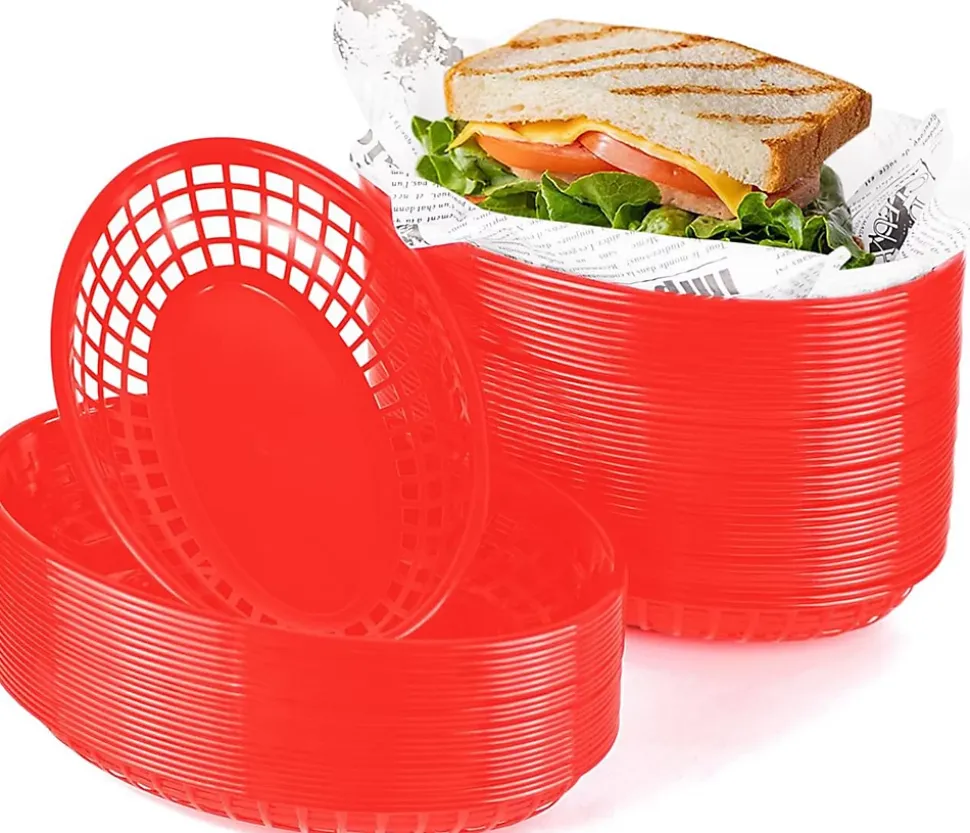 Servez vos aliments facilement avec ce lot de 60 paniers alimentaires en plastique. Idéals pour frites, pain, snacks ou friandises, ces paniers spacieux et robustes conviennent à tous vos événements, des réunions familiales aux grandes fêtes. Fabriqués en plastique durable et réutilisable, ils sont faciles à nettoyer, résistants à l’usage quotidien et permettent de réduire les déchets. Le design coloré et classique rend vos présentations attrayantes, tandis que les poignées confortables et bords lisses garantissent un transport et un service pratiques. Parfaits pour particuliers et professionnels, ces paniers offrent praticité, durabilité et esthétique pour toutes vos occasions.