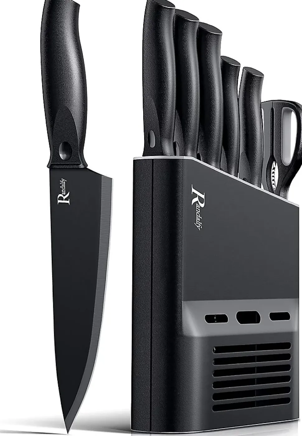 ENSEMBLE PARFAIT: L’ensemble de 7 couteaux de cuisine comprend: un couteau de chef de 8 « , un couteau à pain de 8 « , un couteau Santoku de 7 « , un couteau utilitaire de 5 « , un couteau d’office de 3,5 « , des ciseaux de cuisine, un bloc de couteaux de cuisine en PE. Le bloc de couteaux ne prendra pas en charge beaucoup d’espace et maintient votre cuisine en ordre et mieux pour toutes vos tâches de coupe.HAUTE QUALITÉ: La lame supérieure en acier inoxydable à haute teneur en carbone est appliquée avec la technologie d’oxyde noir , les lames de couteau avec un revêtement antiadhésif en céramique qui rend le tranchage encore plus facile et les lames restent tranchantes plus longtemps. L’ensemble de couteaux professionnels pour la cuisine est pratique, tranchant et précis pour couper les aliments.FACILE À UTILISER : Manche ergonomique en PE pour une coupe précise. Les poignées douces et confortables assurent une prise en main sûre, le couteau ne glisse pas lorsque votre main est mouillée. Et les couteaux de chef sont très faciles à nettoyer. Vous feriez mieux de nettoyer et d’essuyer la lame du couteau avant et après utilisation. Veuillez ne pas utiliser de lave-vaisselle pour préserver la longévité du couteau de cuisine.UTILISATION LARGE: L’ensemble de couteaux de chef polyvalent est la combinaison parfaite d’un design moderne et d’une durabilité essentielle pour les besoins quotidiens de la cuisine. L’ensemble de couteaux de cuisine est un ensemble complet pour hacher, trancher, couper en dés et couper votre viande/légumes/fruits.