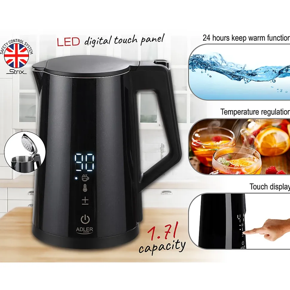 La bouilloire électrique est aujourd’hui présente dans la plupart des cuisines. Grâce à ses nombreuses fonctions, à ses designs et à son design originaux, vous pouvez l’adapter à vos goûts et à l’aménagement de votre pièce. Cette bouilloire moderne de 1,7 litre est fabriquée en STRIX. Sa sécurité est assurée par un verrouillage empêchant la mise en marche à vide, un arrêt automatique après ébullition et le système de contrôle de sécurité STRIX. Sa base stable et son écran LED lisible renforcent sa fonctionnalité. D’une puissance maximale de 2200 W, elle est dotée d’un boîtier à double paroi, ce qui en fait un appareil idéal pour faire bouillir rapidement de l’eau. La température de cuisson est réglable à 40 °C / 55 °C / 80 °C / 90 °C / 100 °C. Le système de contrôle de sécurité STRIX, le boîtier non chauffant et l’écran tactile LED distinguent cet appareil des autres modèles du marché.- Bouilloire électrique avec affichage LED et régulation de la température- Système de contrôle de sécurité STRIX- Boîtier froid au toucher- Capacité max : 1,7 L- Capacité min : 0,5 L- Élément chauffant plat en acier inoxydable de haute qualité- Boîtier à double paroi- Écran tactile- Protection automatique contre l’ébullition sans eau- Affichage LED indiquant la température actuelle- Bip au démarrage et après avoir fait bouillir de l’eau- Température de cuisson réglable 40°C / 55°C / 80°C / 90°C / 100°C- Fonction maintien au chaud 40°C / 55°C / 80°C / 90°C- Fonction de maintien au chaud jusqu’à 24 heures maximum- Indicateur de niveau d’eau interne- Arrêt automatique- Base pivotante à 360°- Rangement du cordon- Alimentation : 220-240V ~50/60Hz- Longueur du cordon d’alimentation : 75 cm- Puissance nominale : 1850 W- Puissance max. 2200W- Dimensions du produit : 26,0 x 22,0 x 16,0 cm- Poids : 1.25 Kg- Couleur : noir- Ty…