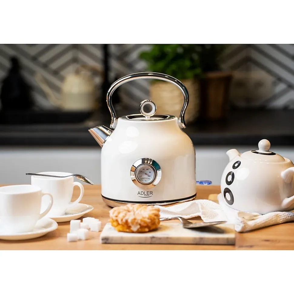 Une bouilloire électrique classique de 1,7 litre avec thermomètre et STRIX, utile dans chaque cuisine. Sa sécurité est assurée par un verrou qui empêche d’allumer une bouilloire vide et par un arrêt automatique après avoir fait bouillir de l’eau. La fonctionnalité est augmentée par une base stable et un indicateur de niveau d’eau clair. Un indicateur analogique de température de l’eau et une forme élancéeSystème de contrôle de sécurité STRIXCompteur de température d’eau analogiqueCapacité maximale : 1,7 litresCapacité minimale : 0,5 litreBase pivotante à 360°Élément chauffant plat facile à nettoyerNiveau d’eau graduéBoîtier en acier inoxydableCouvercle entièrement amovible pour un nettoyage facileFiltre à sédimentsArrêt automatique après avoir fait bouillir l’eauProtection contre l’ébullition à secFusion thermiqueRangement du cordon d’alimentationLa couleur BlancheDimensions du produit : 24,5 x 23,0 x 16,0 cmLongueur du cordon d’alimentation : 75 cmCouleur du cordon d’alimentation : noireType de prise : E/FPuissance 1850-2200WAlimentation 220-240V~ 50/60Hz…