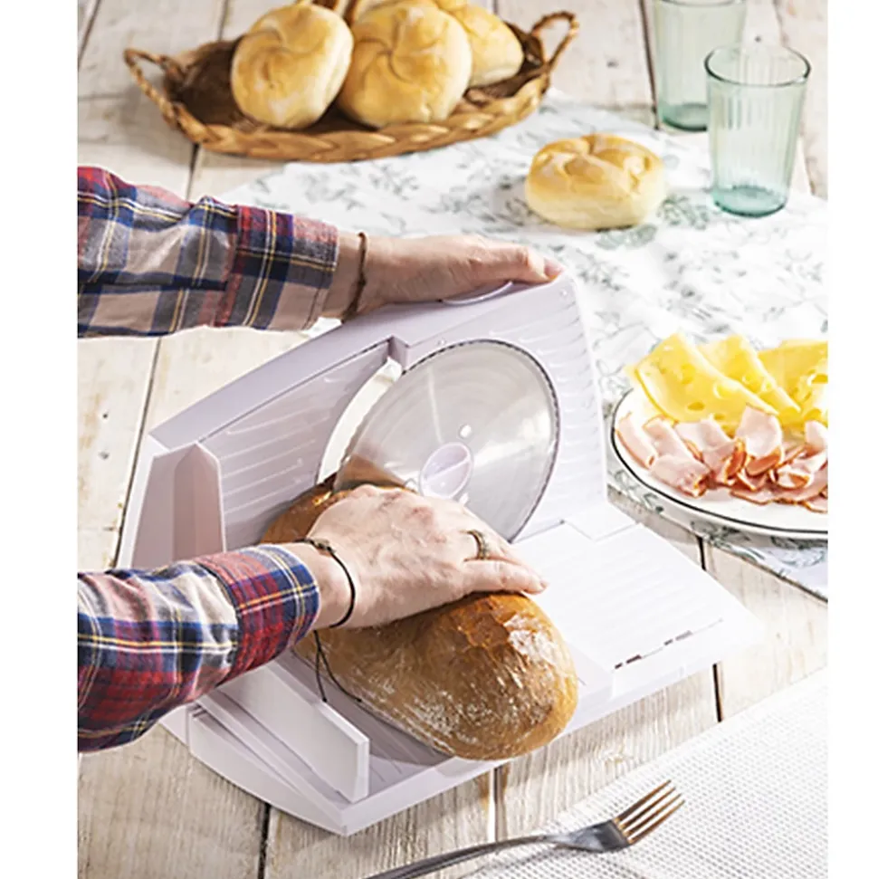 Trancheuse compacte, sûre et facile à plier. Parfait pour couper avec un poussoir amovible. Le plastique résistant qui le compose facilite son transport. La lame en acier inoxydable de haute qualité permet de couper la charcuterie en fines tranches et de couper une solide tranche de pain de campagne. L’épaisseur de coupe peut être facilement ajustée. La trancheuse entière peut être facilement démontée en morceaux, ce qui facilite le nettoyage. Prend très peu de place. Grâce à l’option pliable, après utilisation, vous pouvez le ranger dans le meuble de cuisine. Le bouton de sécurité protège contre les blessures accidentelles. De plus, le poussoir en plastique est conçu pour protéger vos doigts. Les pieds en caoutchouc empêchent la trancheuse de bouger.Puissance : 150 WPuissance maximale : 400 WLame en acier inoxydable de 170 mmÉpaisseur de coupe lisse et réglable de 0 à 15 mmConception pliableAliments poussés avec protège-pouce de sécuritéPieds en caoutchoucLame amovibleConception de stockage de câblesCouleur blancheLongueur du câble d’alimentation : 105 cmMatériau du corps : PlastiqueDimension pliée: 33,5*21*11CMUNITÉ Poids net kg 1,85Dimensions dépliées : 33,5*21*26CMType de fiche : C…