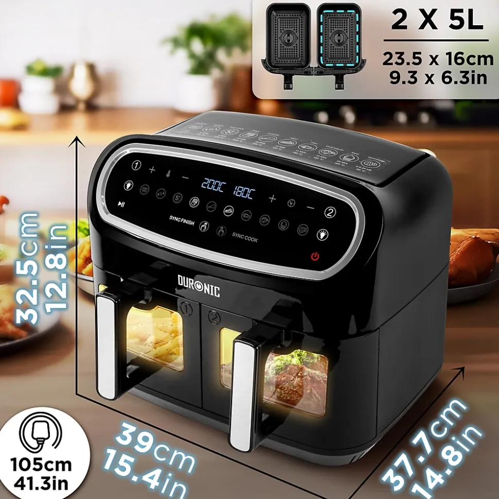 La friteuse à air AF24 de Duronic vous permet de faire frire ou de cuire rapidement vos aliments tels que des frites, du poulet, des légumes, du poisson. Plus rapide et moins énergivore qu’un four, cette friteuse à air qui ne nécessite pas ou très peu d’huile permet également une cuisson plus saine des aliments.L’AF24 possède deux compartiments de cuisson de 5 litres chacun. Vous pouvez donc cuire votre poulet et vos frites en même temps. La fenêtre transparente de chaque compartiment ainsi que les lumières intégrées vous permettent de surveiller la cuisson de vos aliments sans avoir à ouvrir les tiroirs.Dans chacun des compartiment, vous pouvez cuire vos aliments pour plusieurs personnes. Dans l’un vous pouvez par exemple cuire votre viande et dans l’autre, vos frites. Un tiroir de 10 litres, l’AFD1, vendu séparément, est également disponible pour remplacer les deux tiroirs de 5 litres.Cette friteuse à air peut être programmée pour utiliser les 10 modes de cuisson préréglés. Vous pouvez par exemple réchauffer des aliments froids, faire cuire des frites, du poulet, ou des gâteaux, ou encore déshydrater des fruits. L’AF24 a également deux fonctions : la fonction Sync Cook qui vous permet de faire correspondre le même réglage aux deux tiroirs et la fonction Sync Finish qui vous permet de cuisiner sur deux réglages programmés pour que les deux se terminent en même temps.Puissance: 2400W. Capacité totale: 10 litres (2×5 litres). Couleur: noir. Températures de cuisson: 50°C min. et 200°C max. Dimensions: 39 x 37.7 x 32.5 cm. Dimensions du tiroir: 22.5 x 14.5 x 11 cm. Longueur du câble: 105 cm.