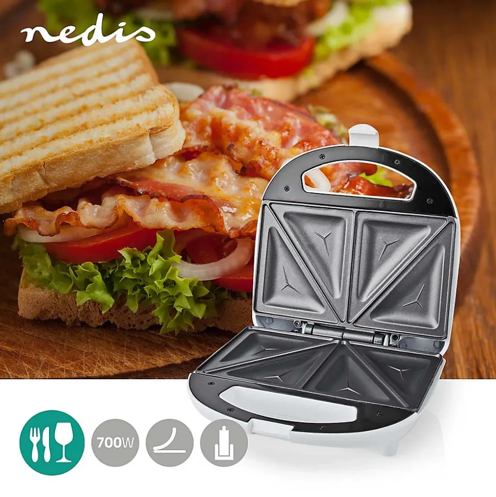 Description du produit :Avec cet appareil à croque-monsieur Nedis de 700 W, vous pouvez griller deux sandwichs simultanément, en un clin d’il. Le voyant d’alimentation et de température vous indique exactement quand vous pouvez utiliser l’appareil. L’appareil à croque-monsieur est équipé de plaques de cuisson antiadhésives faciles à nettoyer, sans efforts, et vous évite d’utiliser de l’huile ou du beurre. L’appareil à croque-monsieur dispose d’une poignée isolée et de pieds antidérapants pour une utilisation sûre et stable. Ainsi, l’appareil reste stable sur votre table ou votre plan de travail.Caractéristiques : Appareil à croque-monsieur d’une puissance de 700 W Poignée isolée pour une utilisation sûre Indicateur d’alimentation et de température Plaques de gril antiadhésives faciles à nettoyer Pieds antidérapants pour une cuisson stable Stockage à la verticale et à l’horizontale grâce à la fonction de verrouillage et au système de rangement du cordon.